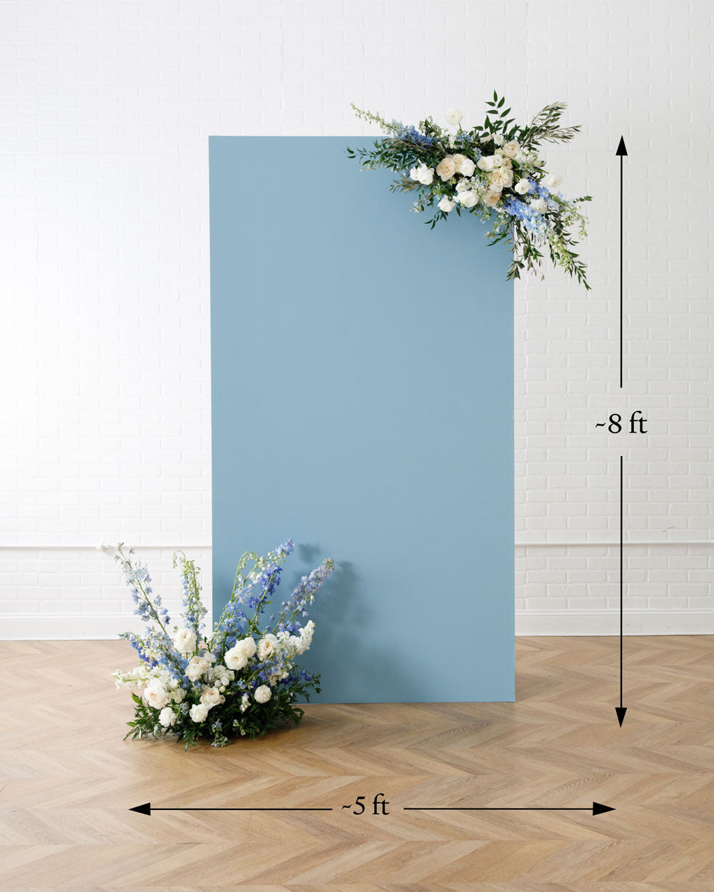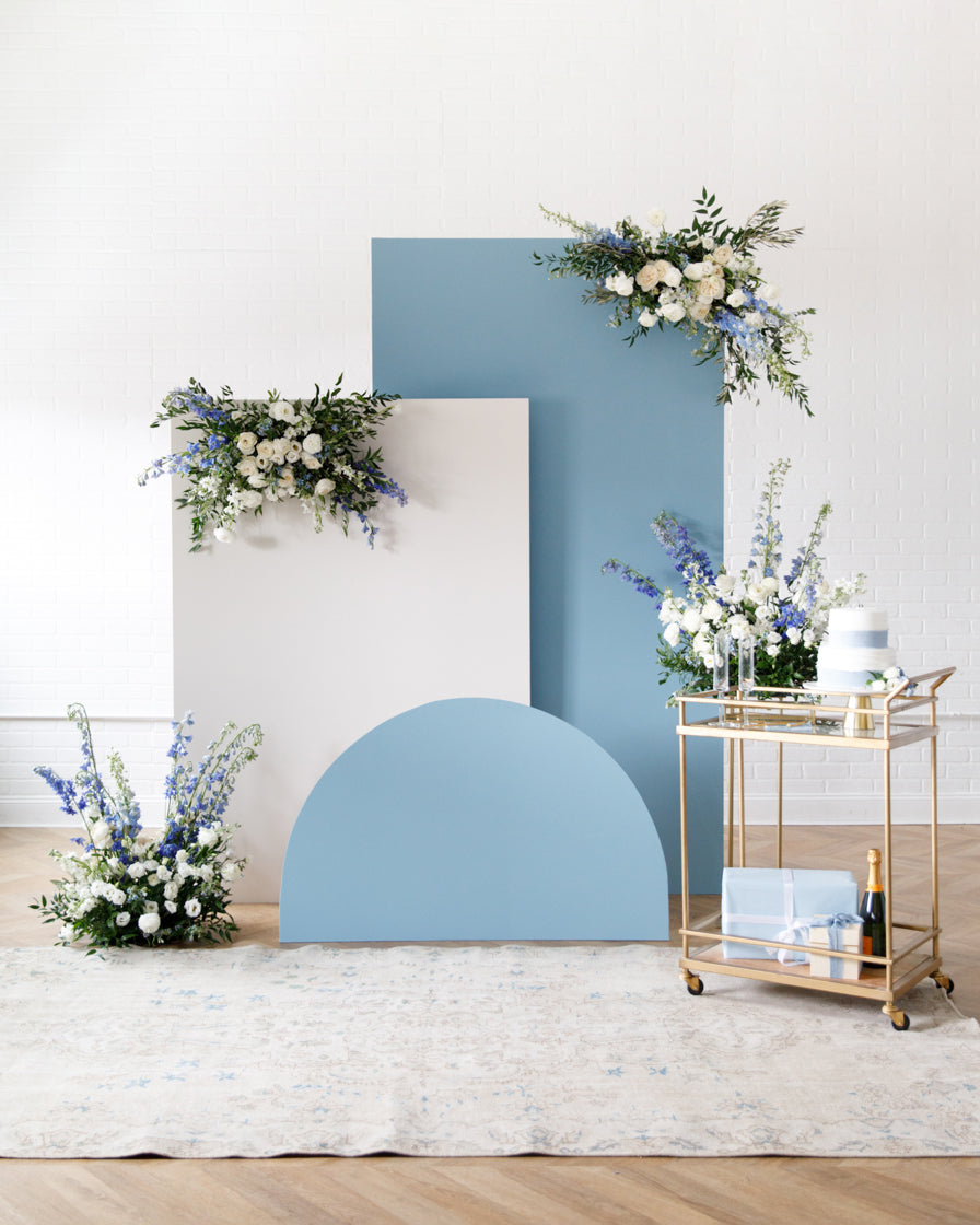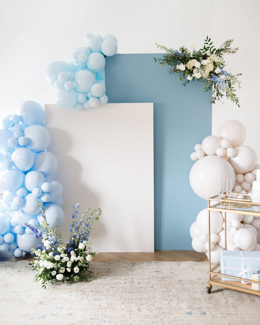 Create a breathtaking moment for your bridal celebration with this panel and floral design. With unique floral centerpieces, and the option to add a balloon garland, you guest will fall in love with this unique backdrop.