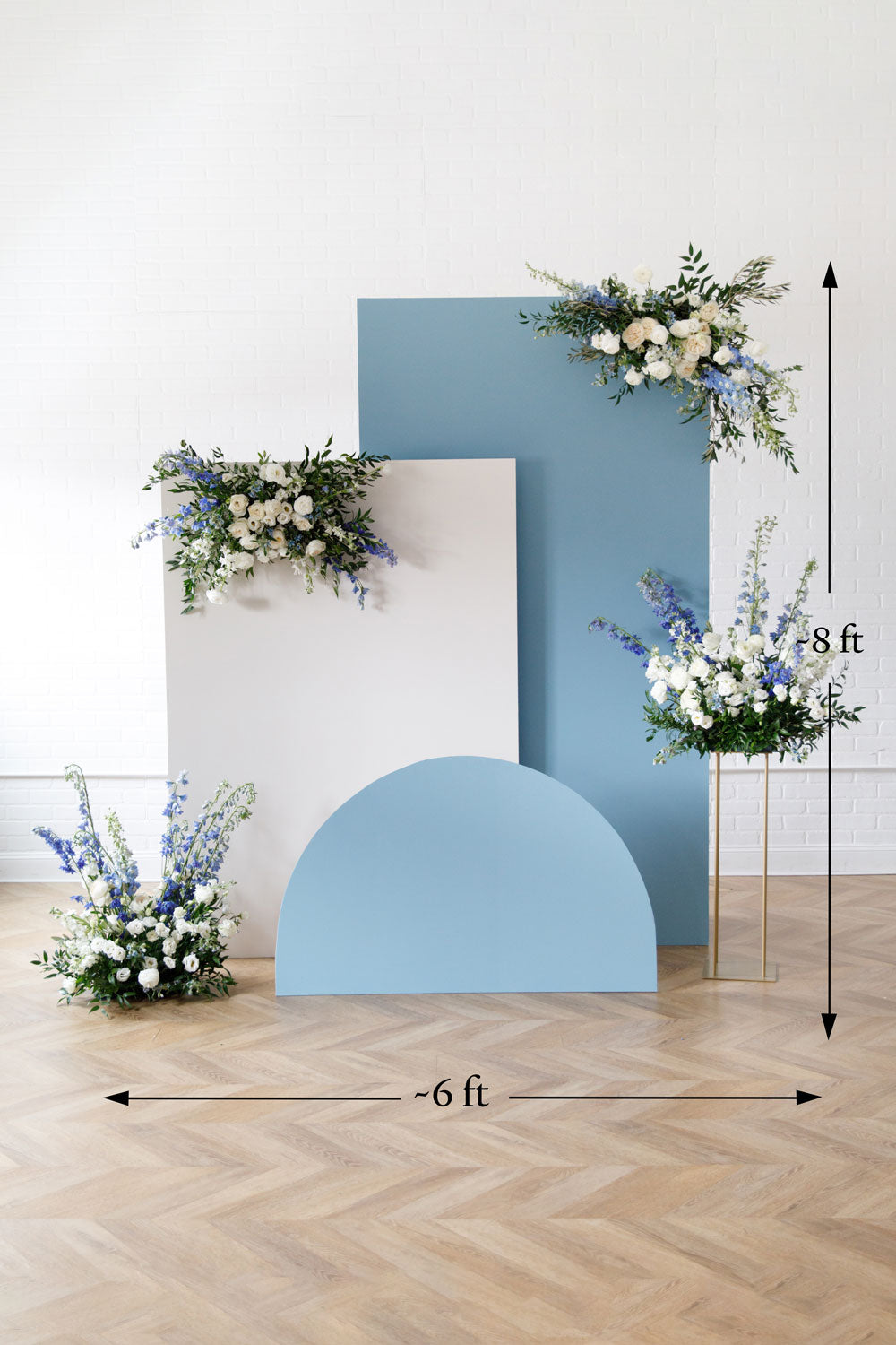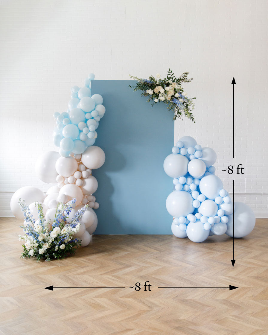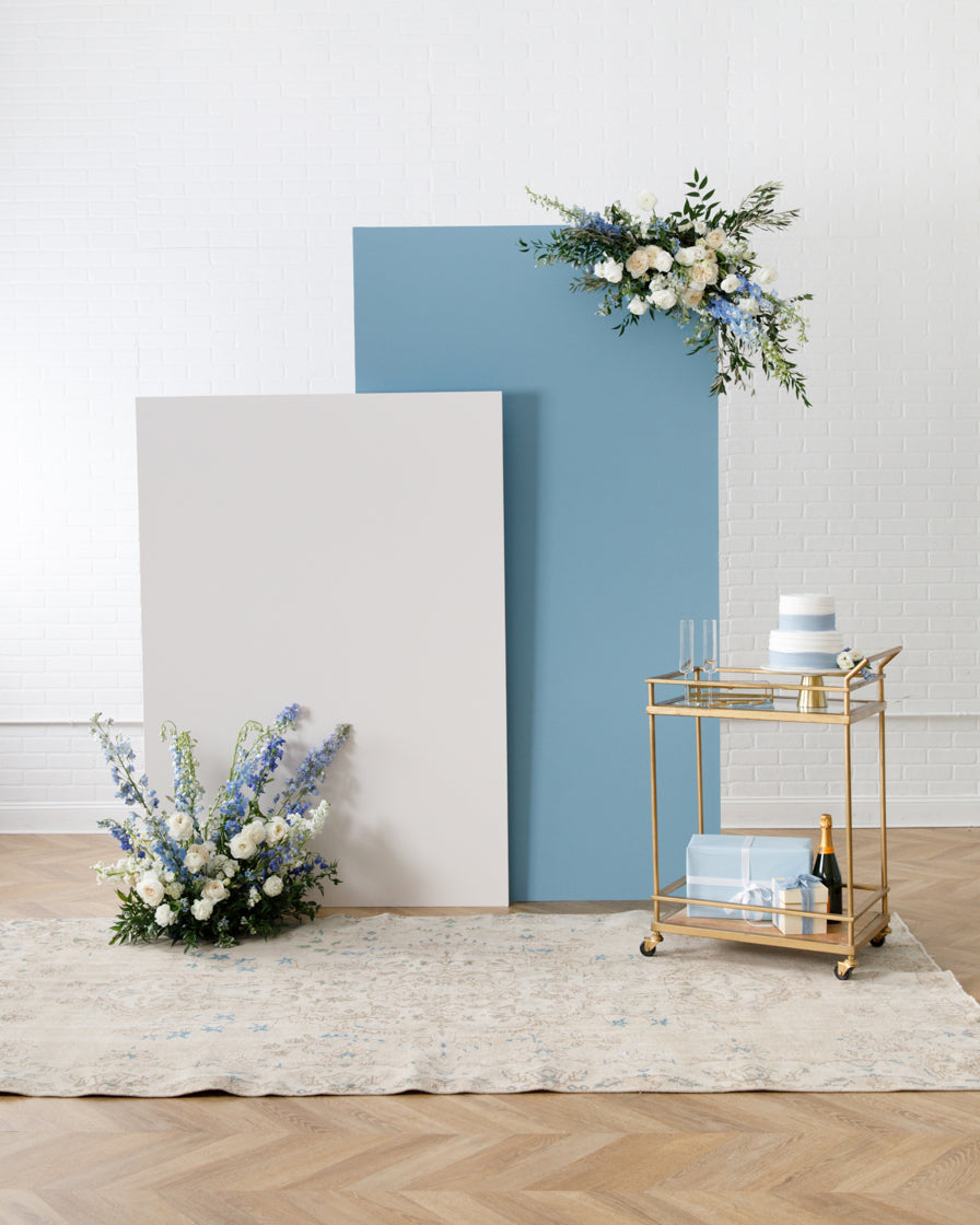 Create a breathtaking moment for your bridal celebration with this panel and floral design. With unique floral centerpieces, and the option to add a balloon garland, you guest will fall in love with this unique backdrop.