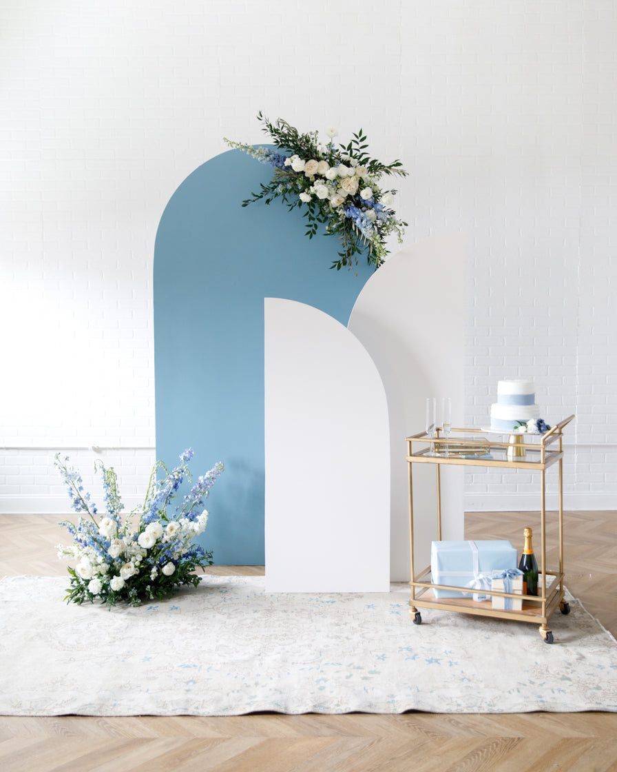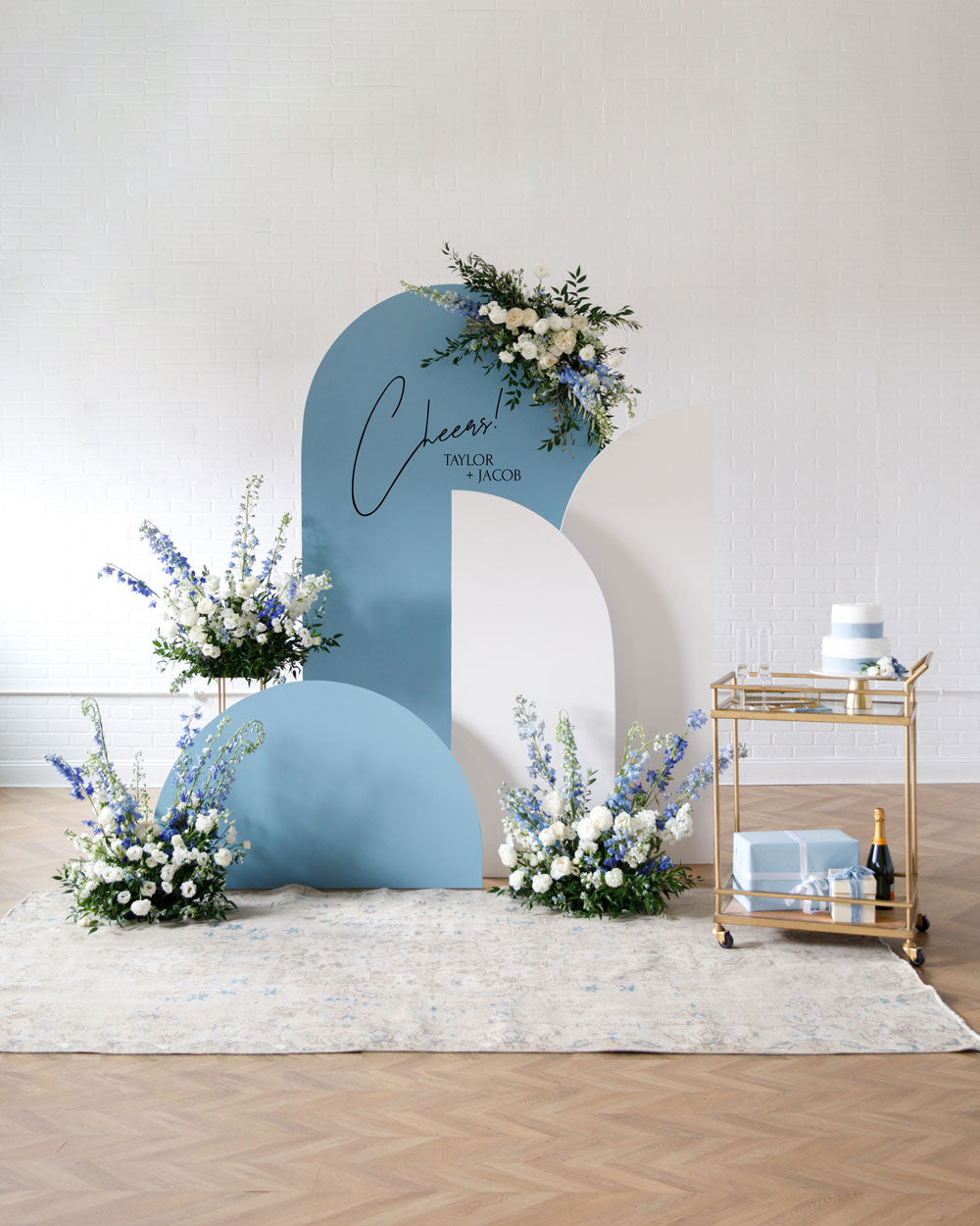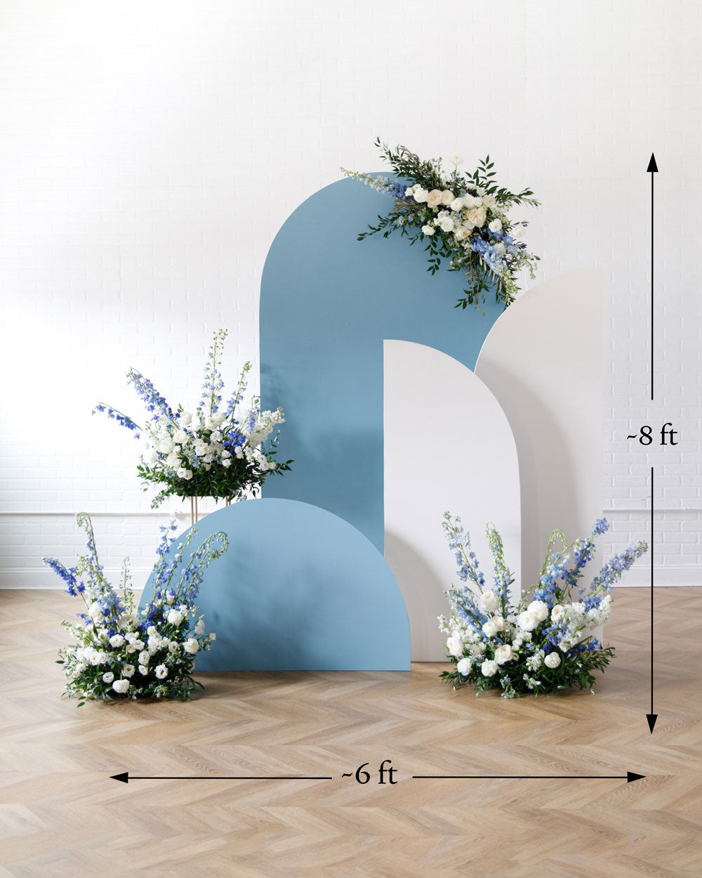 Your celebration will be inspired and beautiful with this panel and floral set. With a modern design and sophisticated floral statement pieces, you can't help but fall in love. Add a stunning balloon garland for additional impact to this display.