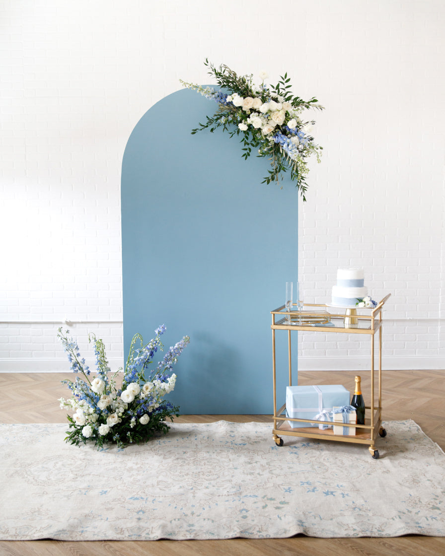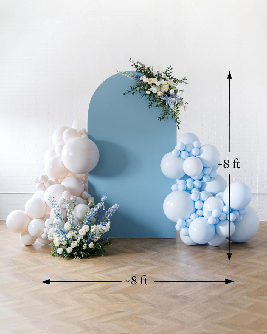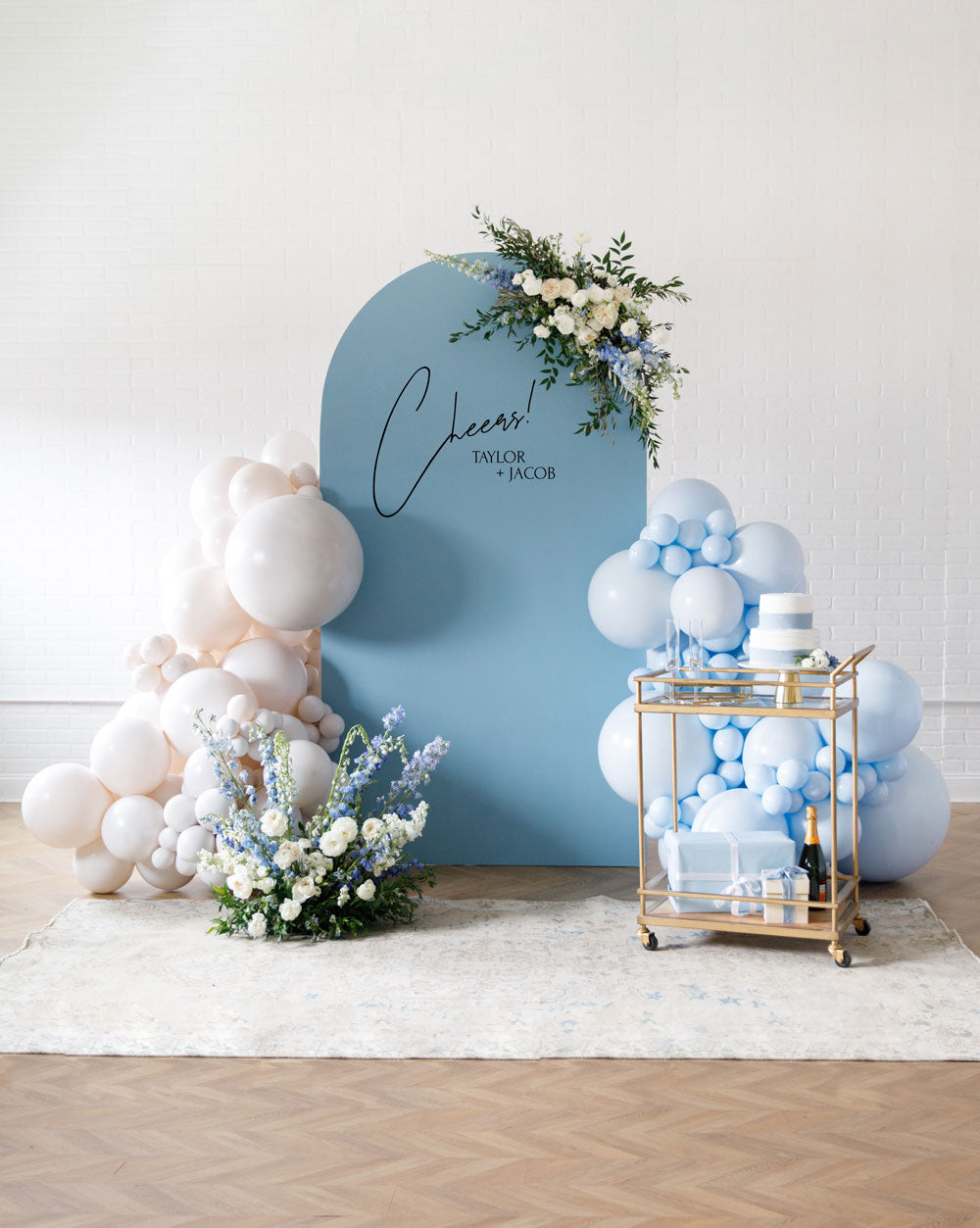 Your celebration will be inspired and beautiful with this panel and floral set. With a modern design and sophisticated floral statement pieces, you can't help but fall in love. Add a stunning balloon garland for additional impact to this display.