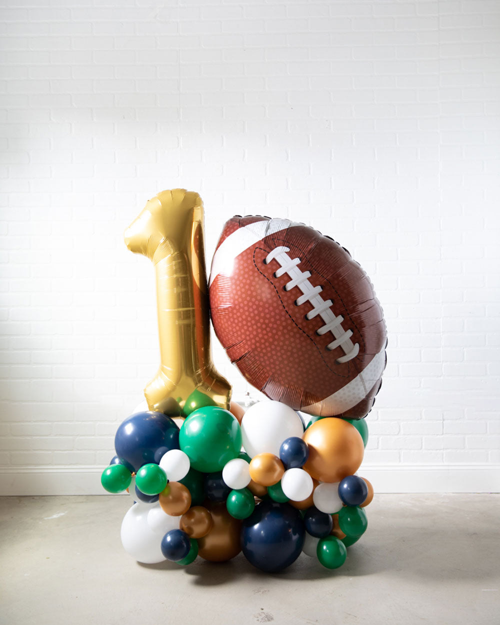 Add a fun touch to your little boys birthday with our football inspired number and foil pedestal. This includes a 34" gold number and football balloon to make a statement at your football themed party. Celebrate any age and dress up your sweets table or photo backdrop for a unique look.