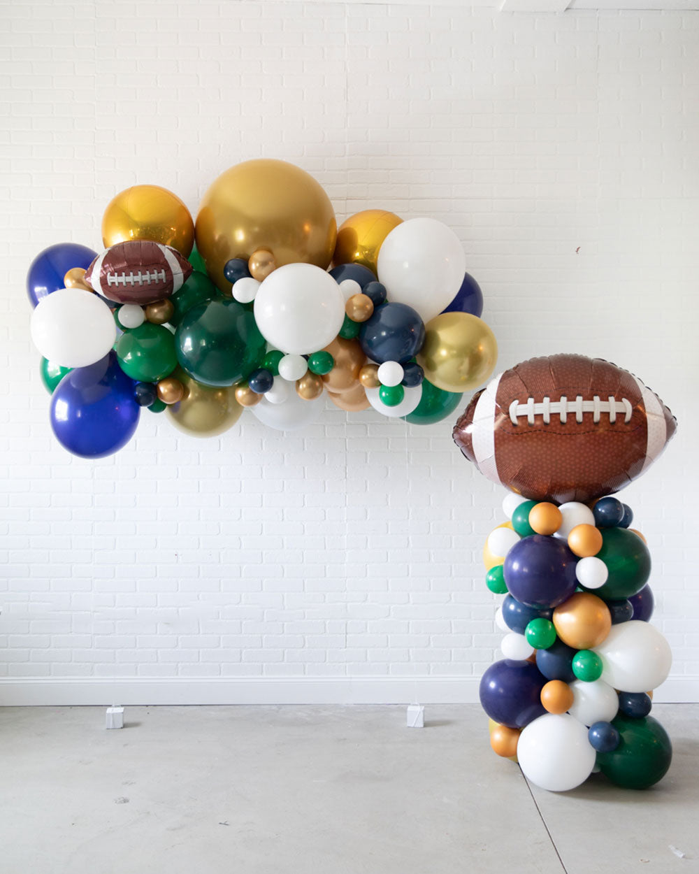 Create a statement for your kids football themed birthday party with our floating arch and column set. This includes a football themed floating balloon arch and matching column with a football themed mylar balloons to make a football birthday party extra fun.