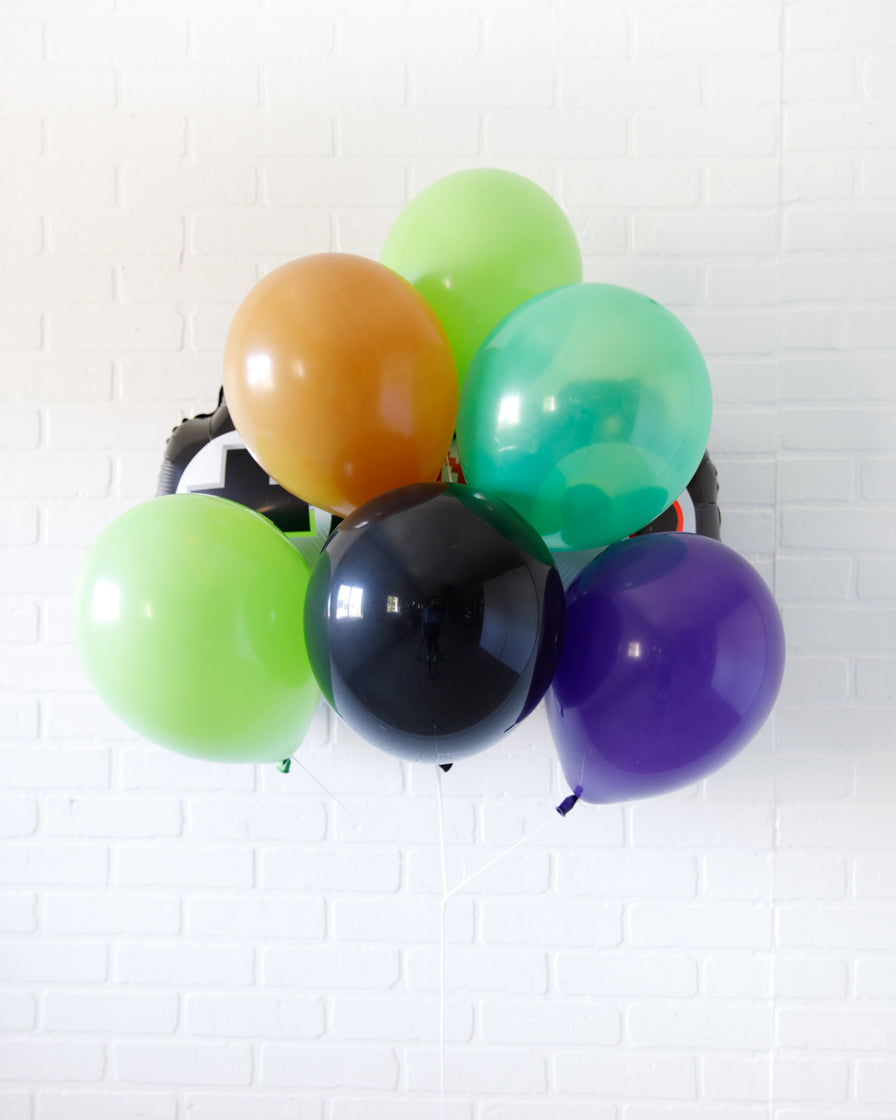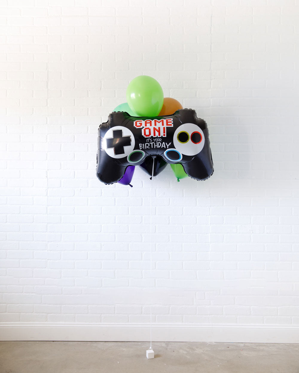 This fun bouquet with bright helium-filled balloons and a foil happy birthday Game Controller balloon is great for a Minecraft themed kids party. Place around the room or near a sweets table and photo backdrop for extra impact.