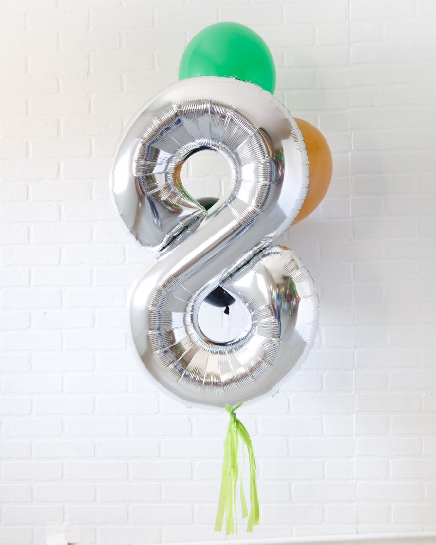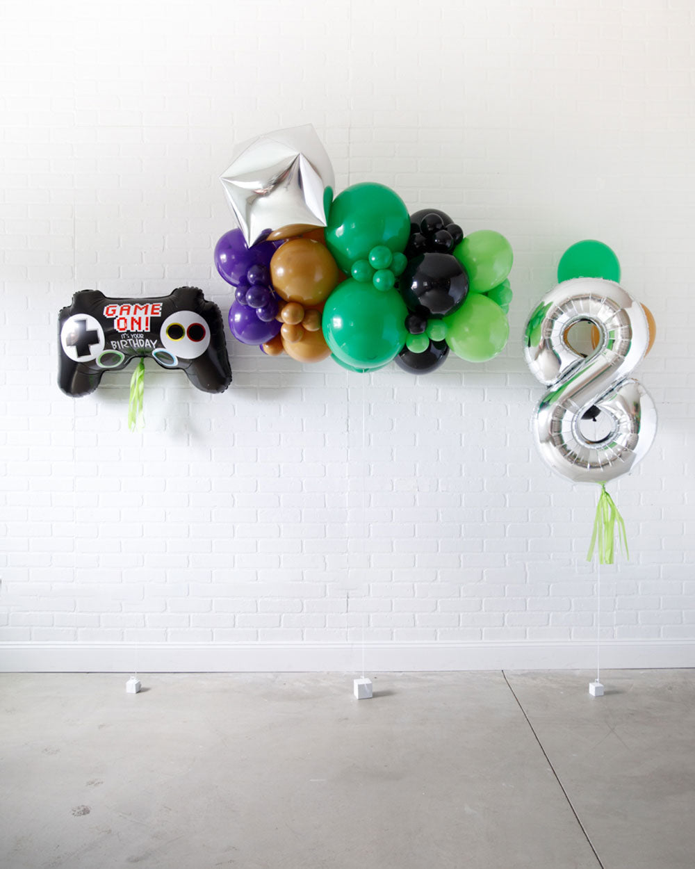 Create a super fun Minecraft birthday with this picture perfect set. This includes a 3ft floating balloon garland, Game Controller balloon and silver number balloon bouquet. Use this anywhere to create an instant party.