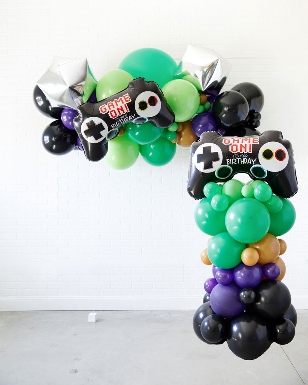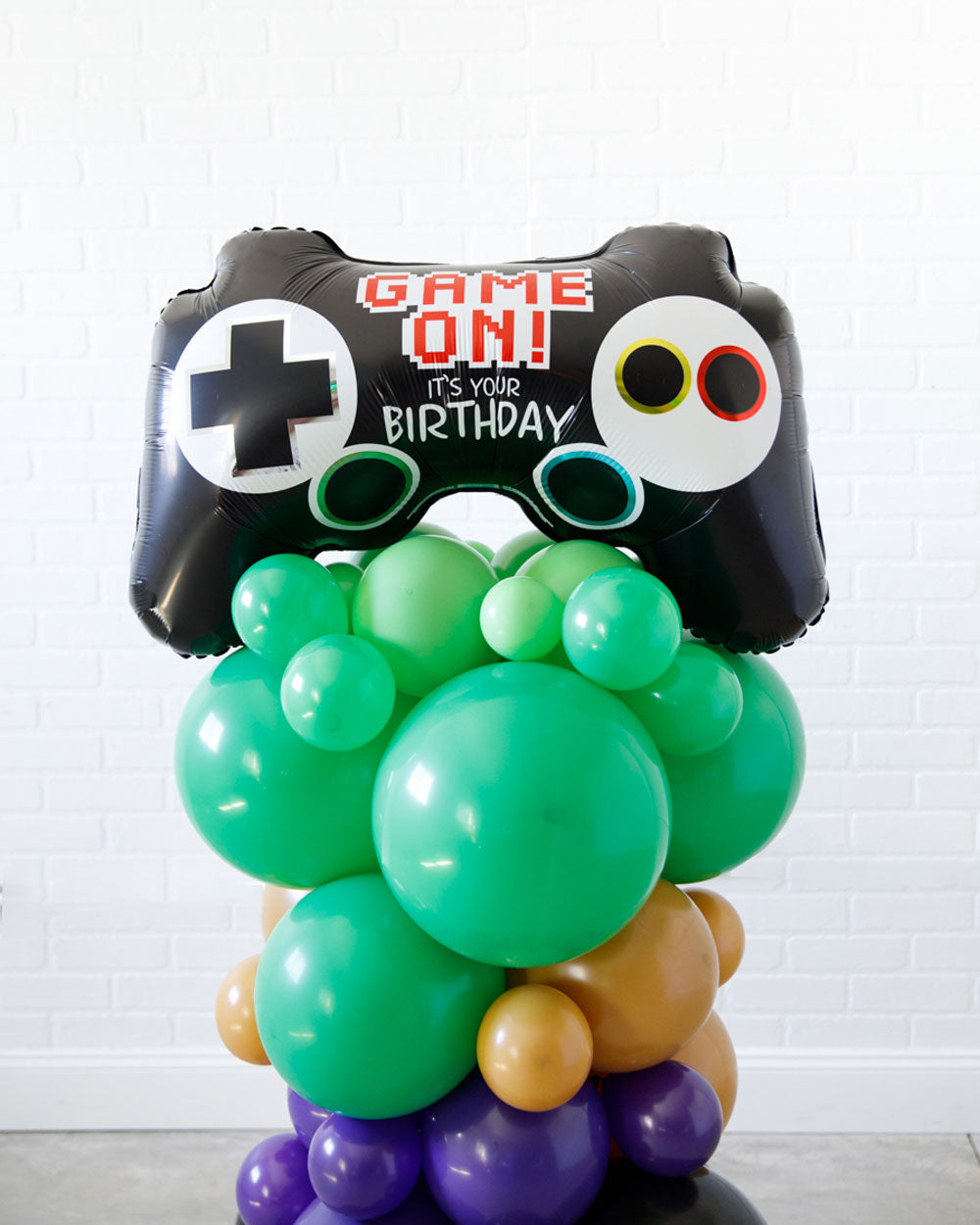 Create a statement for your kids Minecraft themed birthday party with our floating arch and column set. This includes a Game Controller themed floating balloon arch and matching column with a Game Controller themed mylar balloons to make a Minecraft birthday party extra fun.
