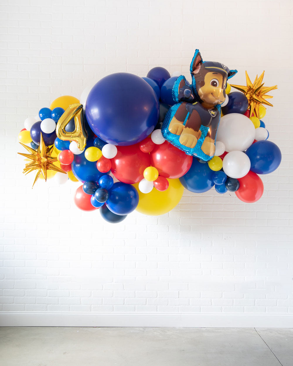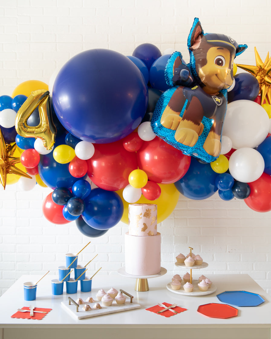 Spread some cheer with this eye-catching balloon garland. A great way to celebrate an important occasion, this air-filled 6ft balloon backdrop piece can be installed above a sweets table or on a wall for a photo op. Includes a Chase Paw Patrol balloon and gold number foil. Complete the look with giant balloons or balloon columns from this Paw Patrol collection.