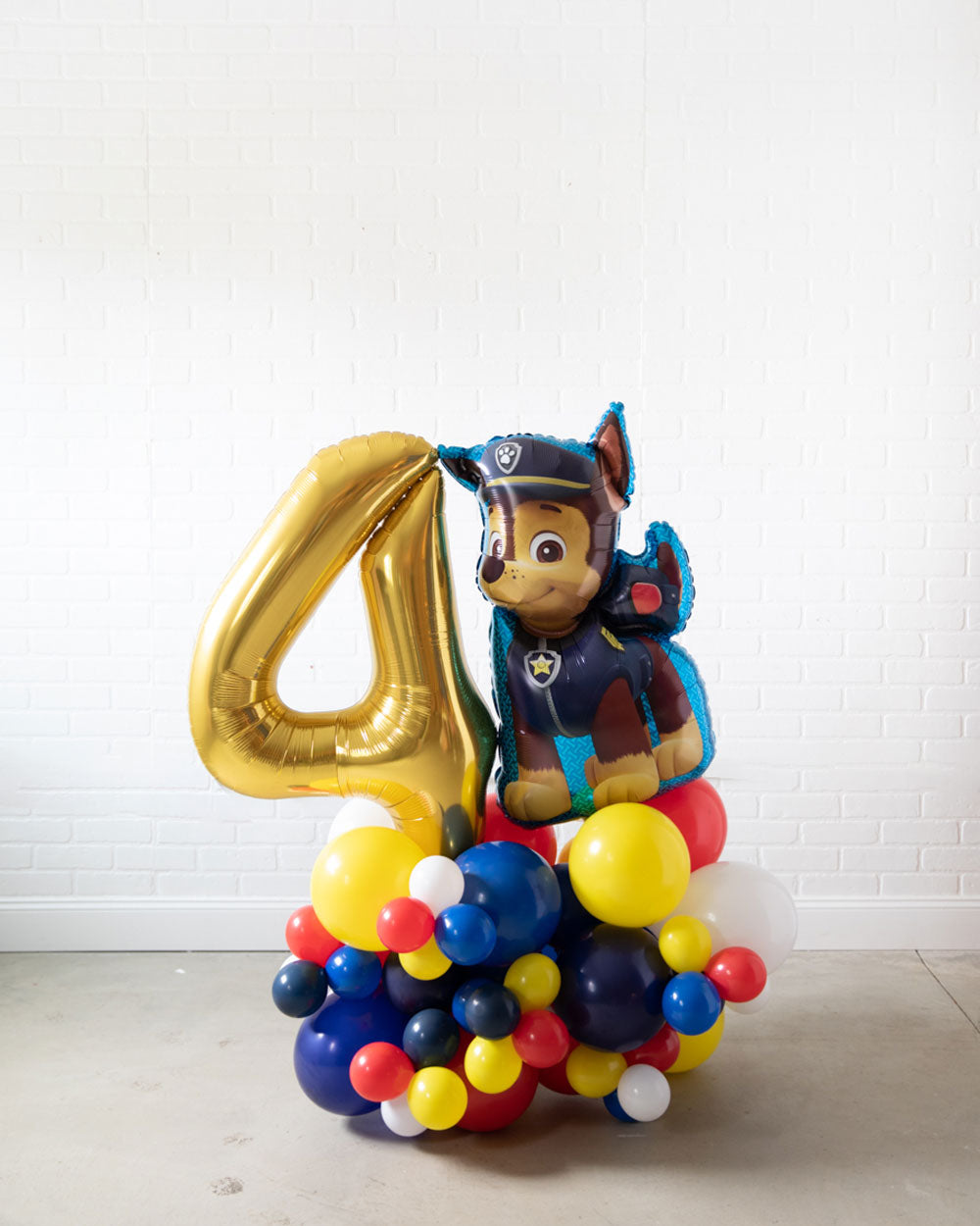 Add a fun touch to your little boys birthday with our Paw Patrol inspired number and foil pedestal. This includes a 34" gold number and Chase Paw Patrol balloon to make a statement at your Paw Patrol themed party. Celebrate any age and dress up your sweets table or photo backdrop for a unique look.