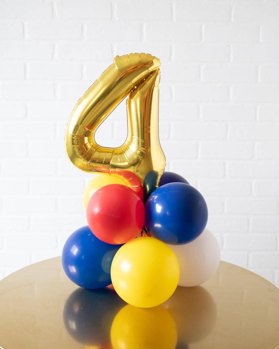 Dress up the table with a fun Paw Patrol birthday decoration. This easy table decor includes a gold number to celebrate any age and air filled latex balloons in bright shades for a fun Paw Patrol themed party.