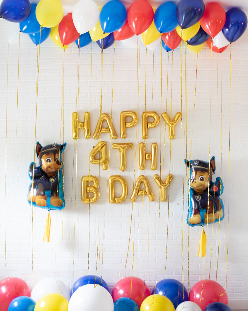 Create a Paw Patrol inspired party for his birthday. This set includes helium filled ceiling balloons, floor balloons, a balloon banner, and two Chase Paw Patrol foil balloons to complete the look.