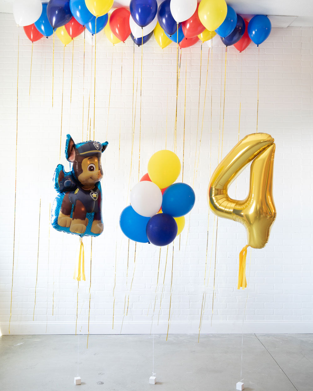 Fill the room with this super fun Paw Patrol balloon set! This includes ceiling balloons, a Chase Paw Patrol balloon, number balloon and a balloon bouquet that make the perfect backdrop. Use these bright balloons for your little boys Paw Patrol themed party.