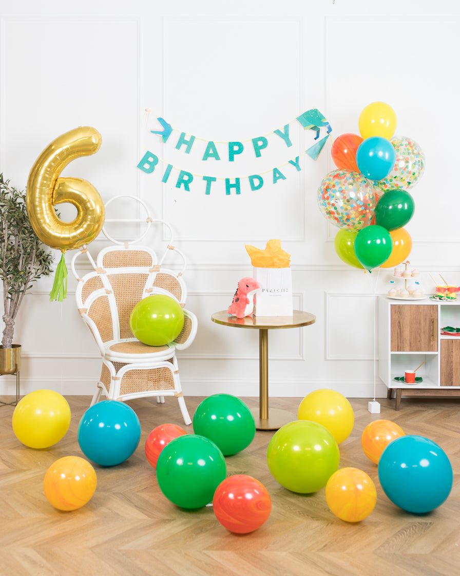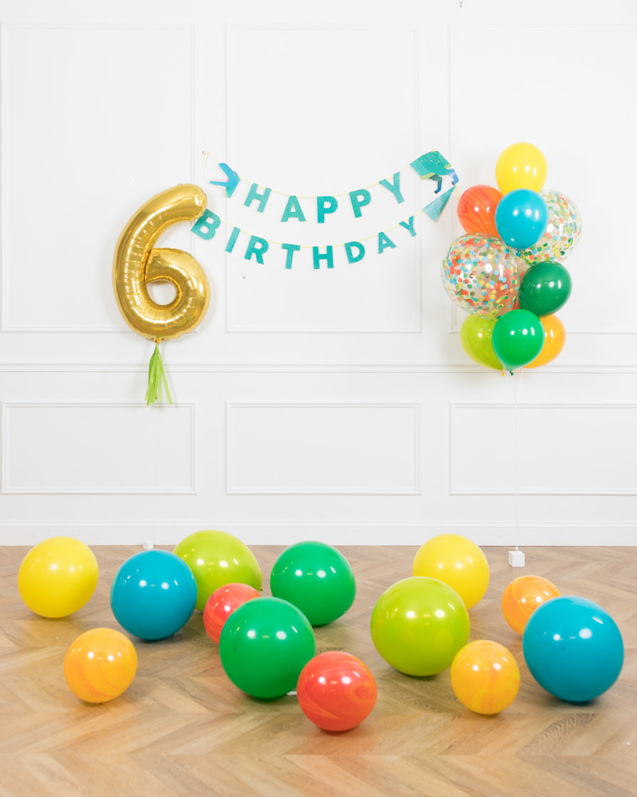 Bring plenty of fun and color to your space with this dinosaur birthday set. This includes a gold number balloon, dinosaur-themed happy birthday banner, confetti balloon bouquet, and floor balloons that'll work in any space with ease.
