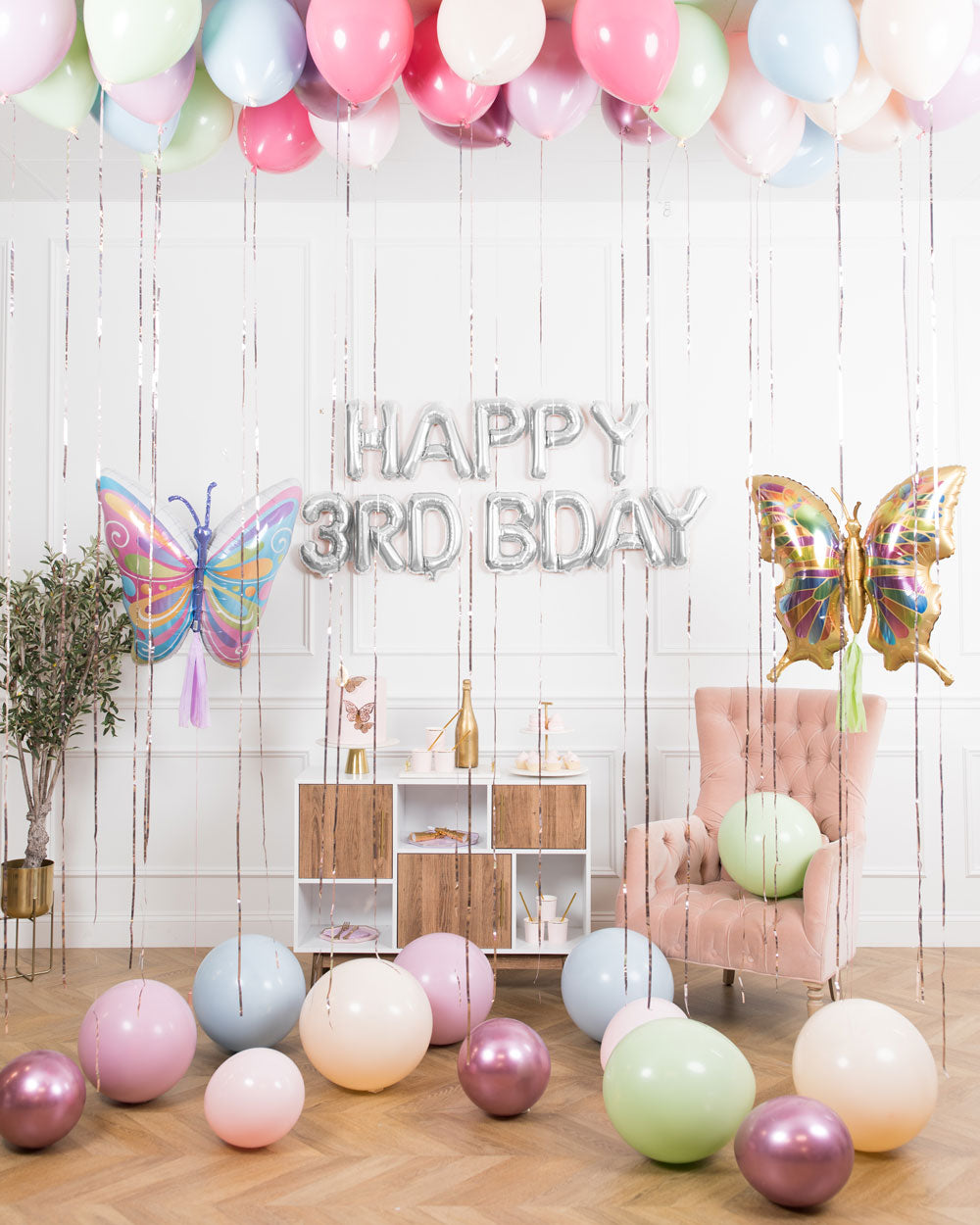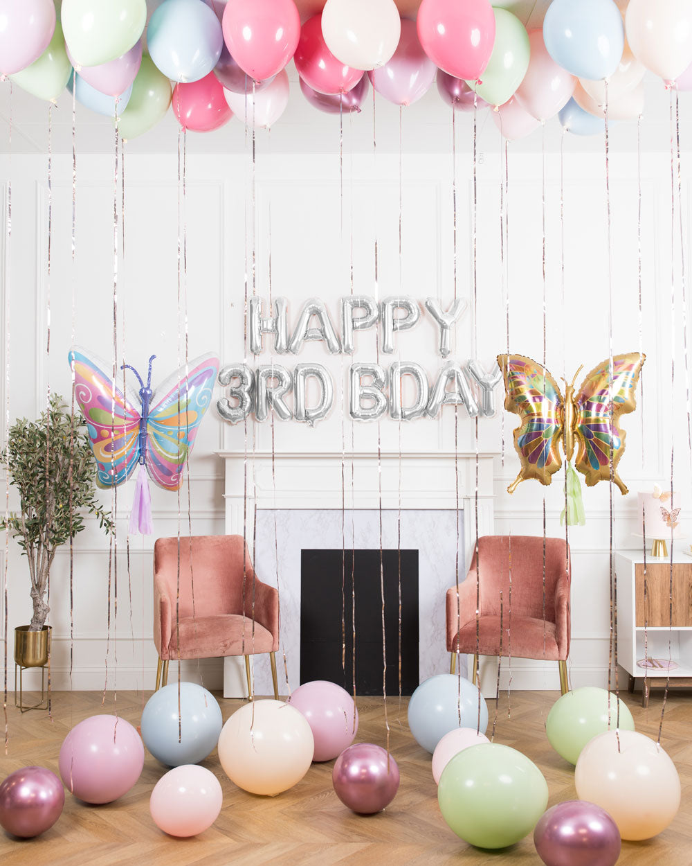 Create a beautiful bash with a butterfly-inspired birthday. This set includes helium-filled ceiling balloons, floor balloons, a balloon banner and two butterfly foil balloons to complete the look.