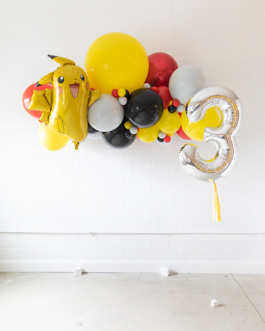 Put the ultimate party together with this Pokemon balloon birthday set. This set includes a floating balloon arch including a Pikachu and silver foil number. In bold shades, this works perfectly for a little boy's Pokemon themed birthday party.