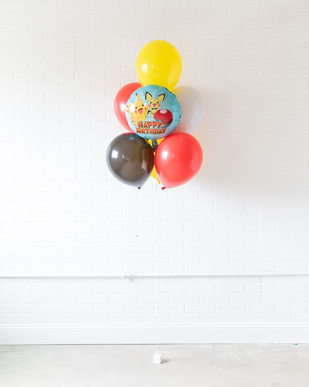 This fun bouquet with bright helium-filled balloons and a foil birthday HBD balloon is great for a Pokemon themed kids party. Place around the room or near a sweets table and photo backdrop for extra impact.