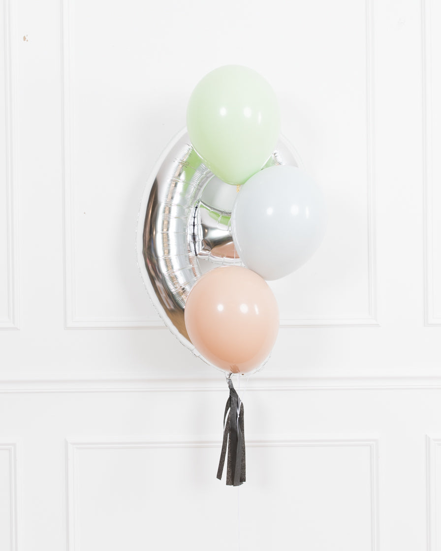 Everyone's favorite, the 34in foil number and skirt turned into a bouquet. This includes a silver number balloon and bright helium-filled balloons for an effortless look. Great as decor or as photo prop.
