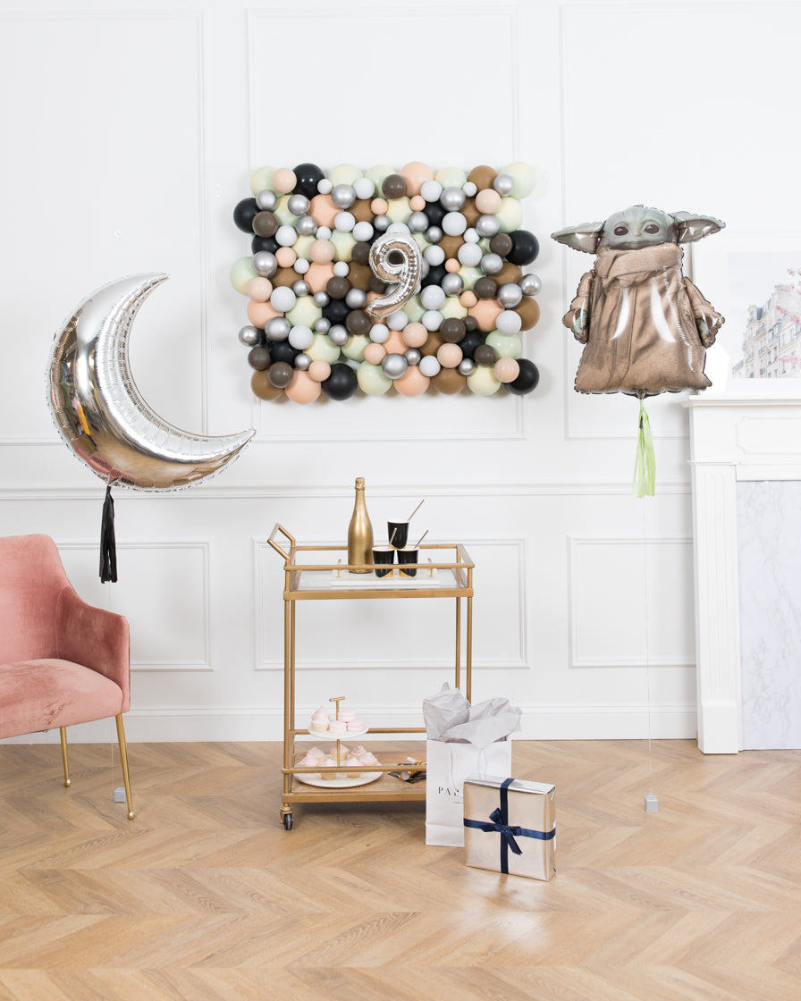 Make the ultimate birthday backdrop with this fun and festive mandalorian star wars inspired backdrop. This set includes a moon and baby yoda mylar, and a colorful balloon wall to create an unforgettable party.