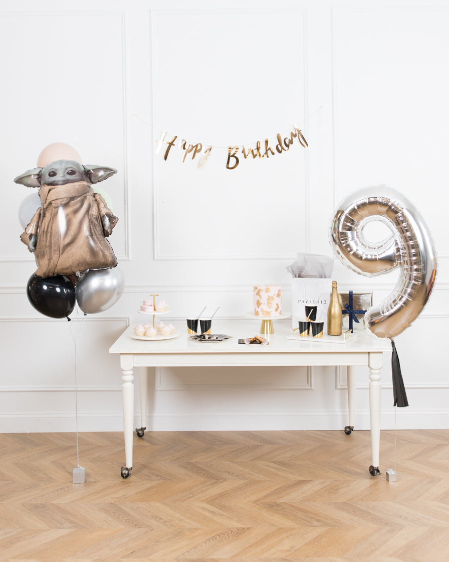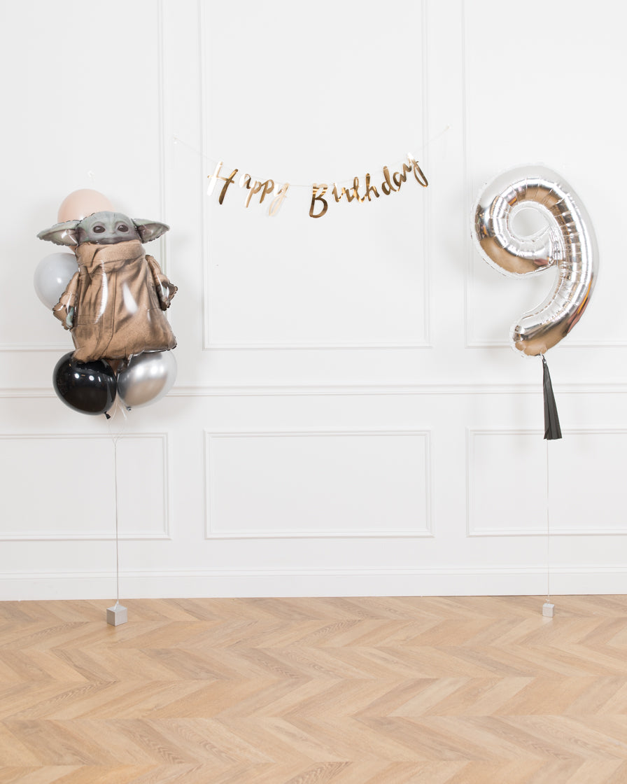 Bring your party together with this adorable and easy mandalorian birthday package. This set includes a baby yoda balloon bouquet, birthday banner and a foil number BALLOON, which easily transforms any room or sweets table.