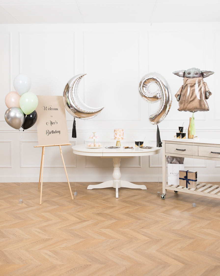 Create an extra fun birthday with this intergalactic party set. This includes a moon and baby yoda balloon, bouquet of latex balloons and a silver number foil balloon. Use this around the room of any space for extra fun birthday decor.