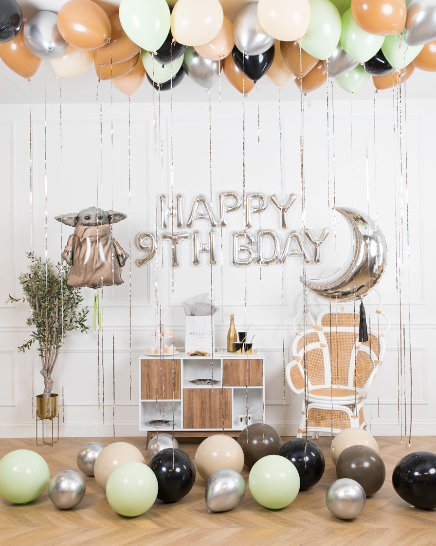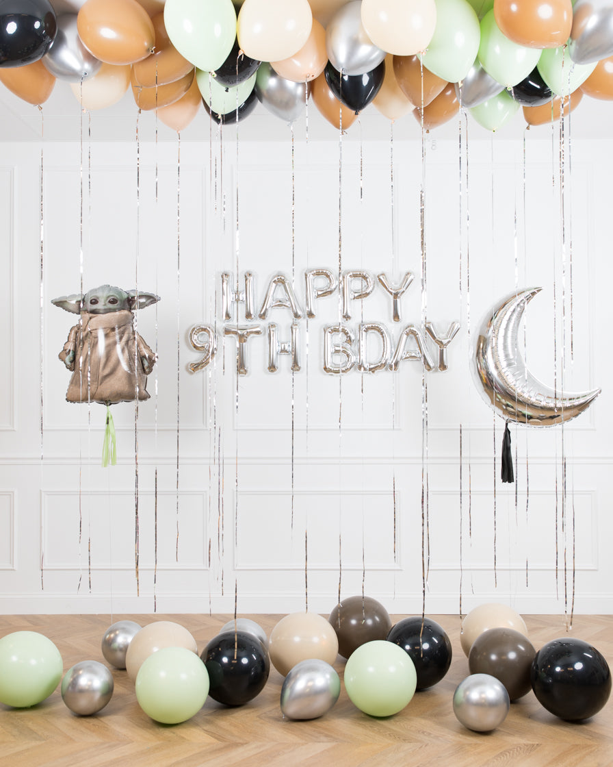 Create a birthday bash with a Star Wars mandalorian inspired birthday. This set includes helium-filled ceiling balloons, floor balloons, a balloon banner, moon and baby yoda foil balloons to complete the look.