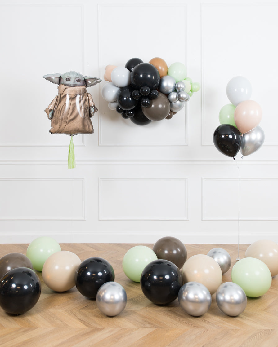 Bring the party to life with this fun and festive Mandalorian themed birthday set. This includes a baby yoda balloon and 3ft air filled balloon garland. With a balloon bouquet, add this to your sweets table for an amazing celebration.