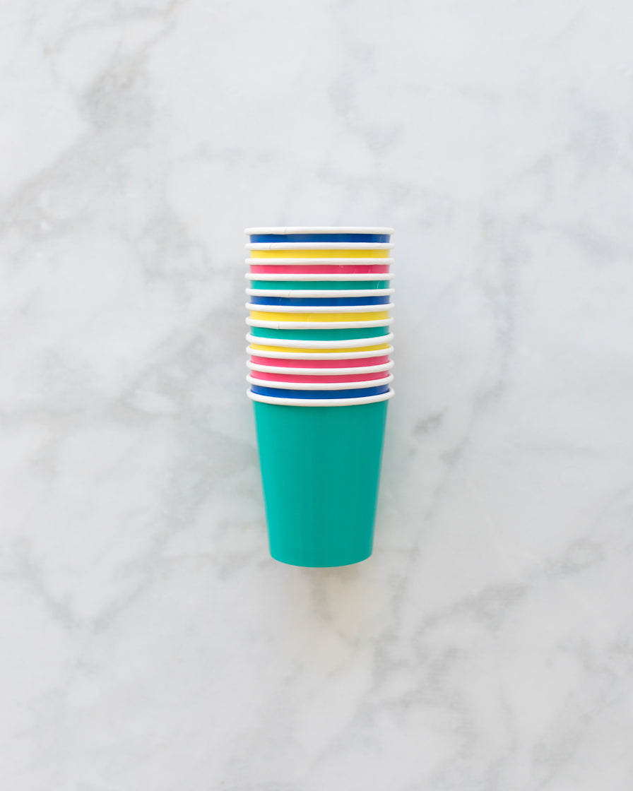Pack of 12 Cups - 3 Blue, 3 Yellow, 3 Pink and 3 Green.