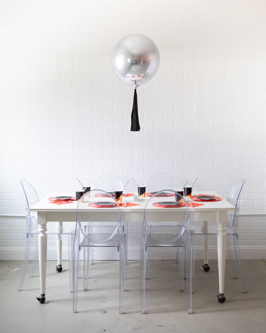Bring your race car themed party table to life with our silver orb with black skirt! Add this to tables for a bright pop of color for his race car themed birthday party. Also, a great choice for sweets table and favor's cart.