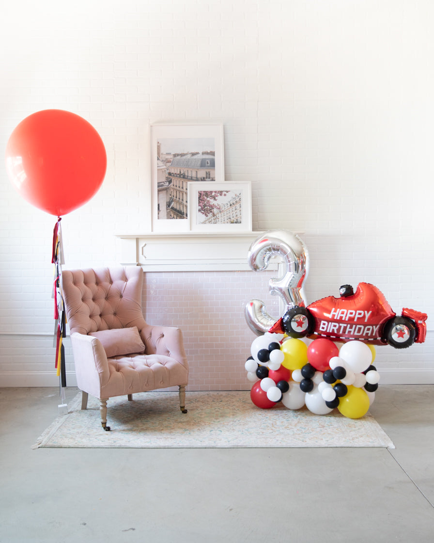 Our race car themed giant balloon is a picture perfect balloon decoration for a Race Car themed kids birthday. This helium-filled balloon with matching tassel garland is a fun addition to any party. Place near a sweets table or photo backdrop for maximum fun.