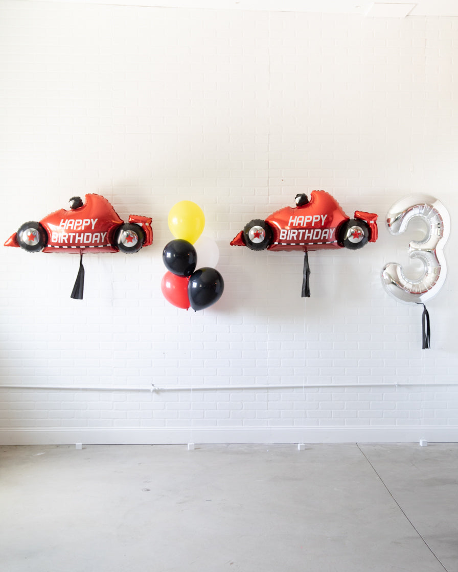 Create an extra fun birthday with this race car party set. This includes two dinosaur balloons, bouquet of latex balloons and a silver number foil balloon. Use this around the room of any space for extra fun birthday decor.