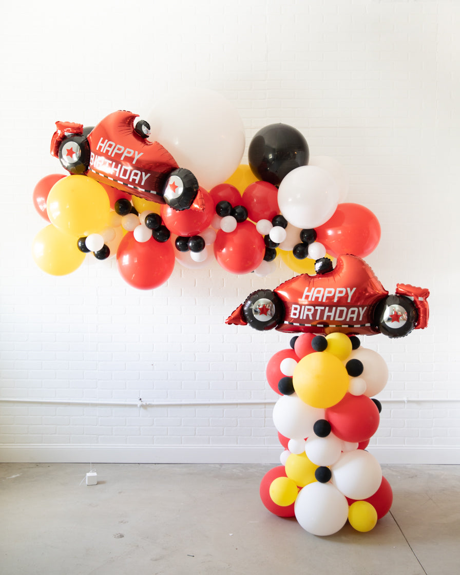 Make the ultimate birthday backdrop with this fun and festive race car inspired backdrop. This set includes a Race Car mylar, and a colorful balloon wall to create an unforgettable race car themed party.