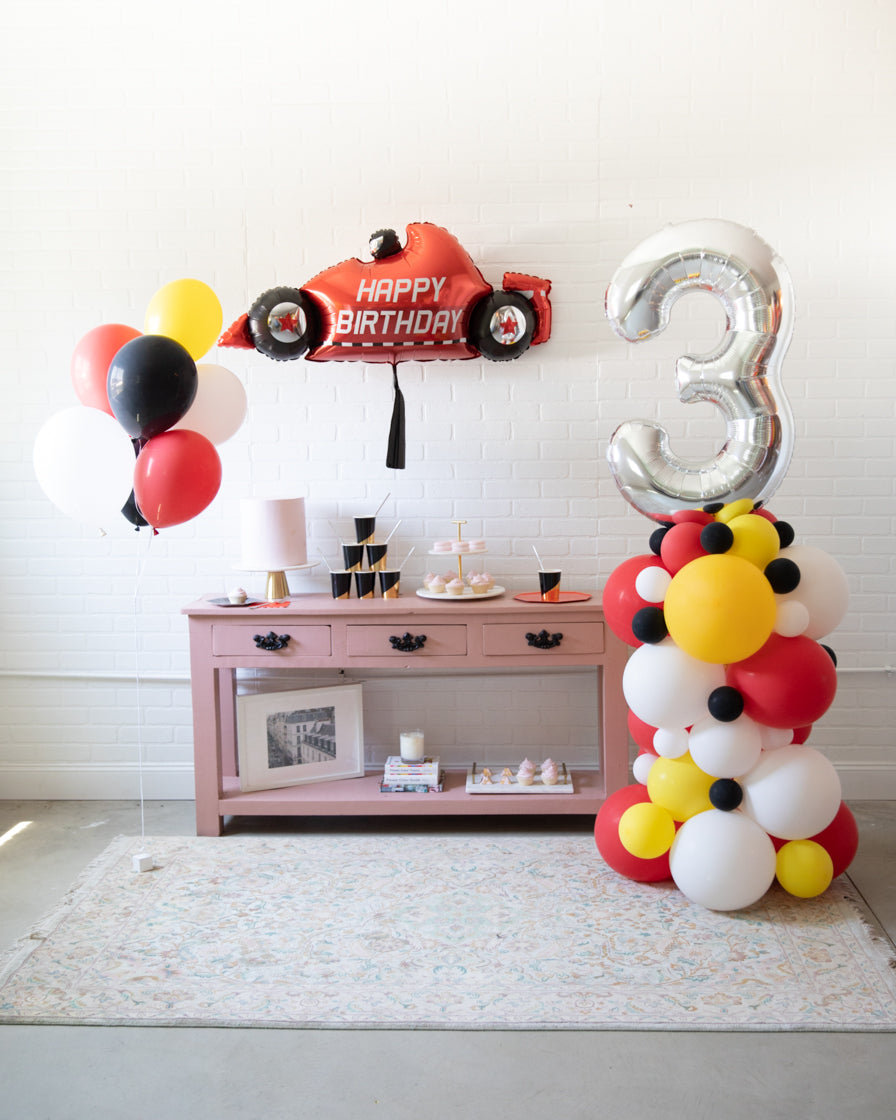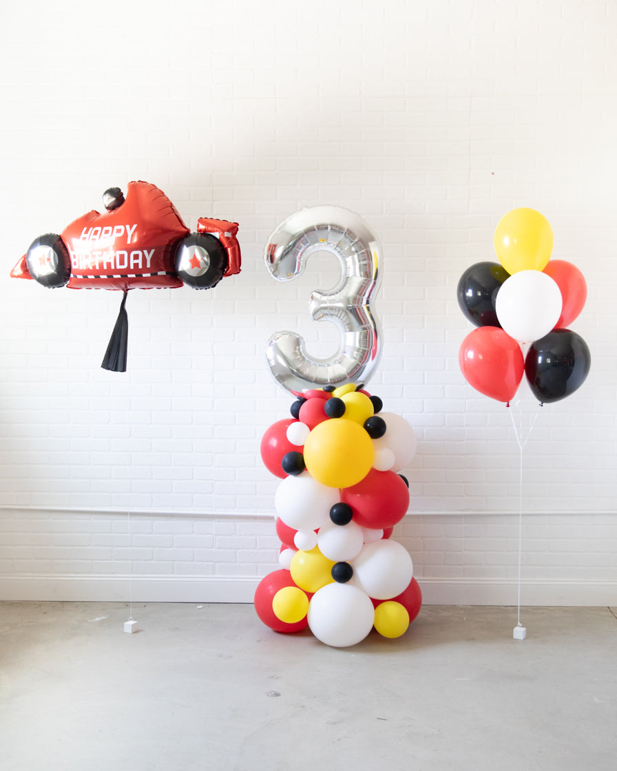Add plenty of fun to your race car inspired birthday for your little one. This includes a Race Car mylar balloon, balloon bouquet and a silver number balloon column, to dress up any space in style.