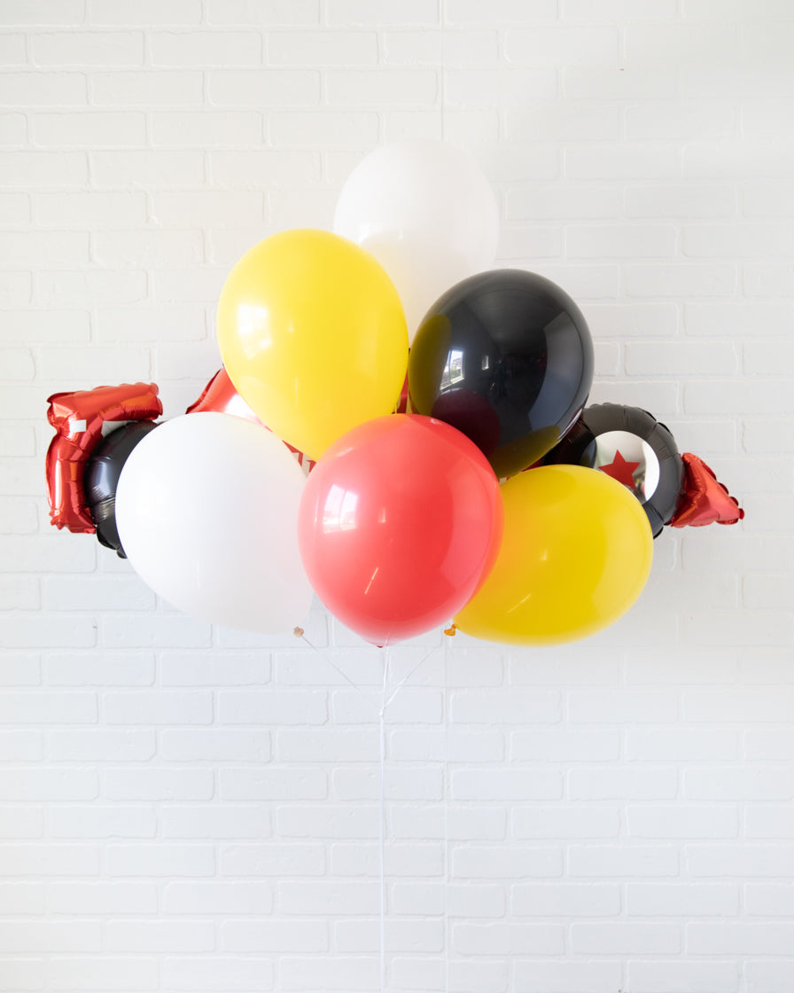 This fun bouquet with bright helium-filled balloons and a foil happy birthday Race Car balloon is great for a race car themed kids party. Place around the room or near a sweets table and photo backdrop for extra impact.