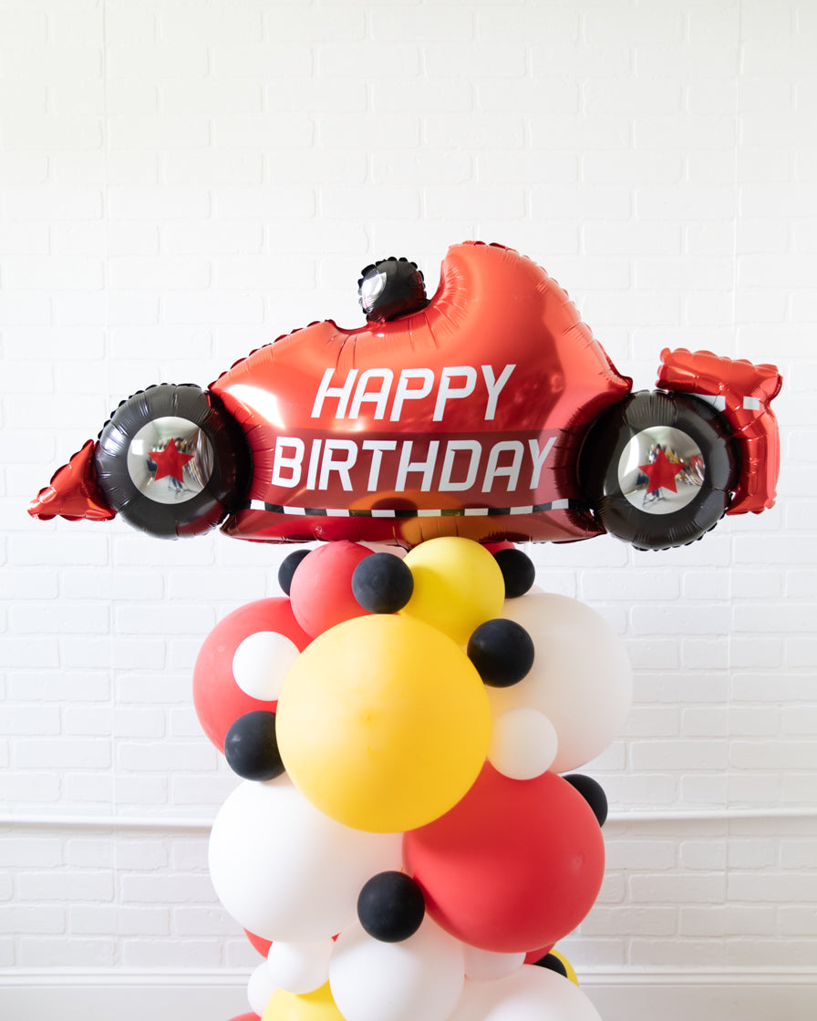 Our race car inspired balloon column is a hit for your little boys birthday party! Created with air filled bright balloons and topped with a Race Car balloon, this arrangement is perfect for a boys birthday of any age. Use this for a sweets table or part of your photo backdrop.