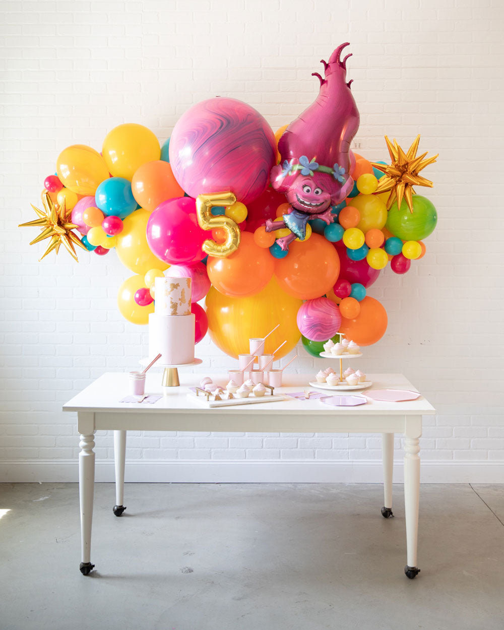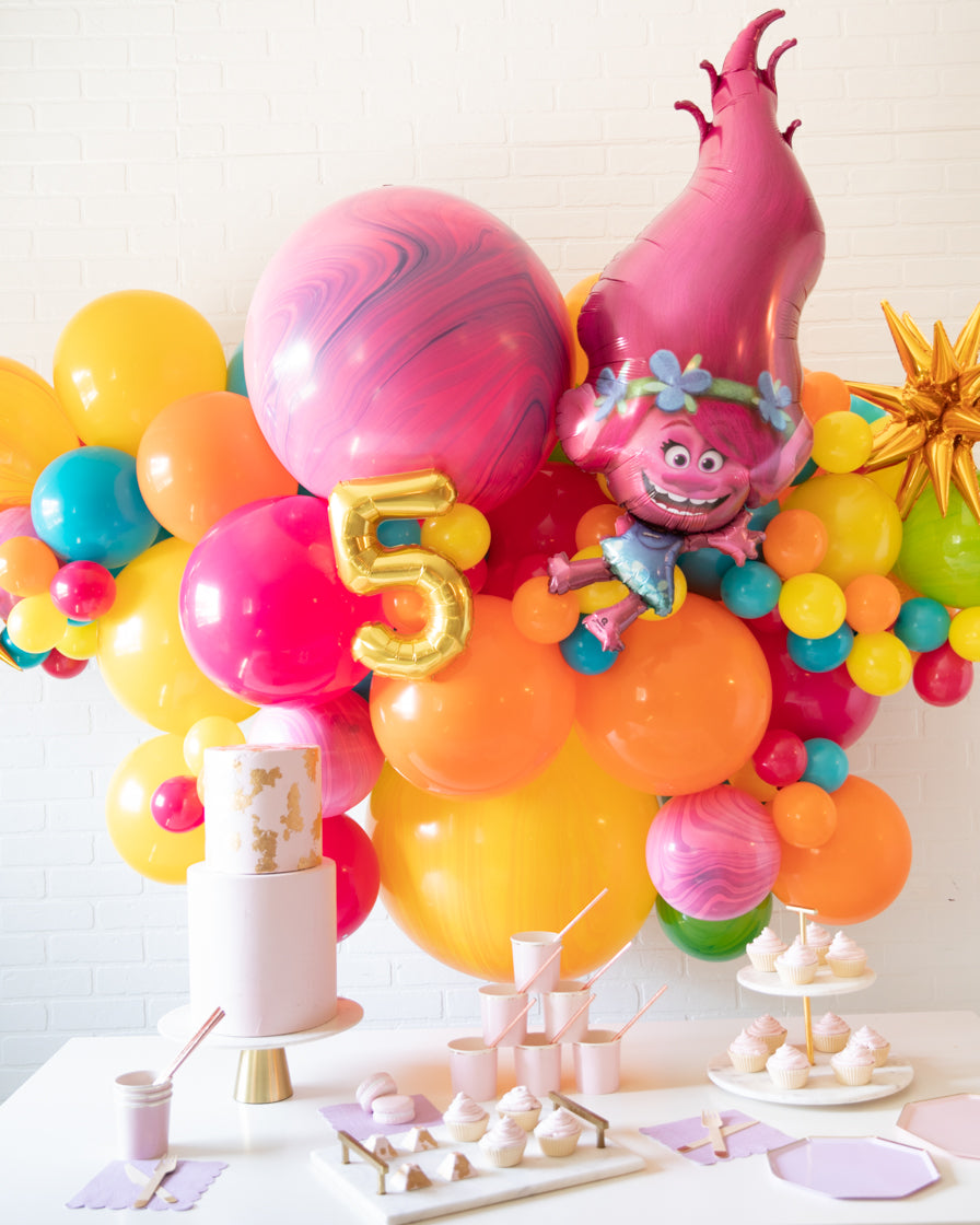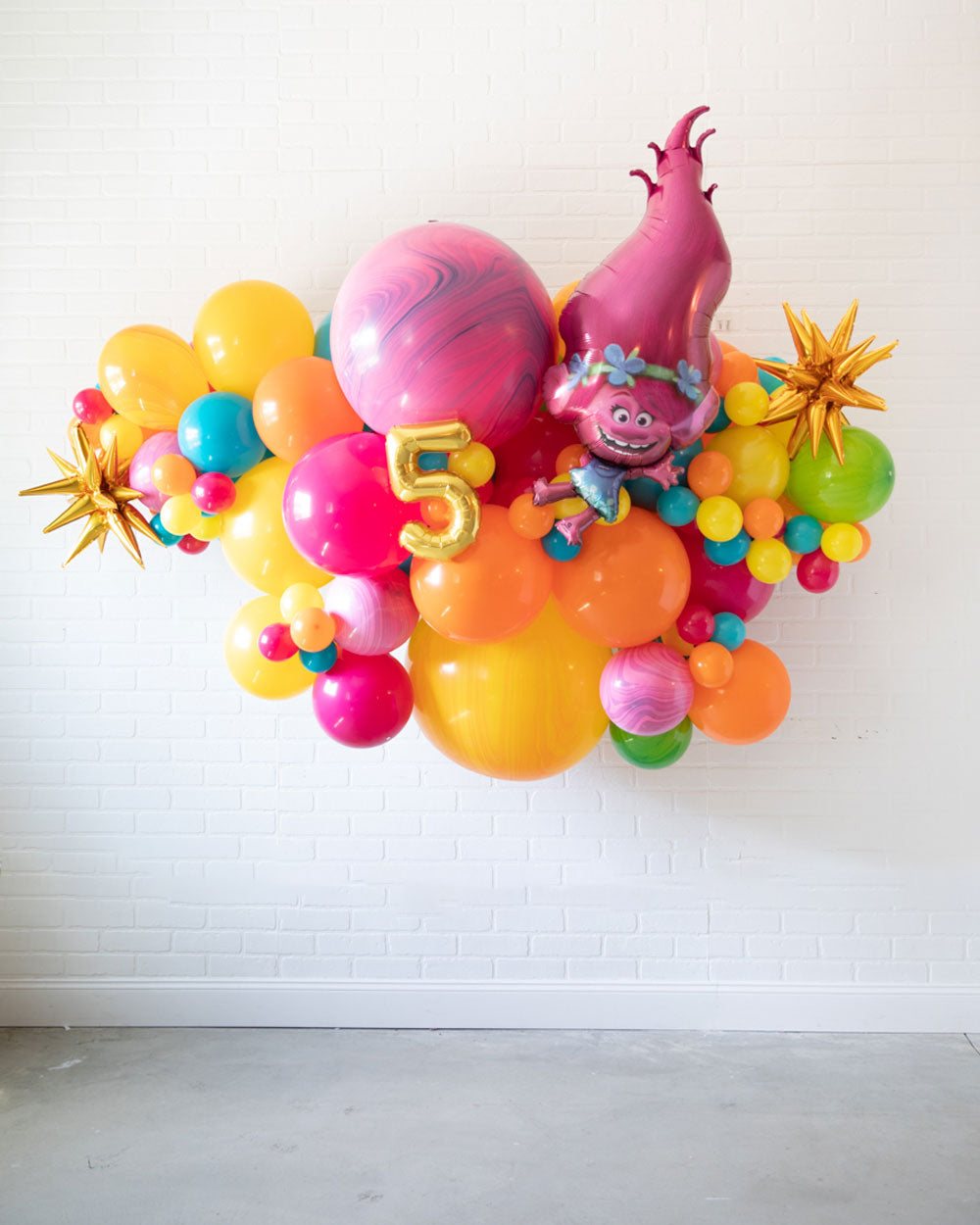 Spread some cheer with this eye-catching balloon garland. A great way to celebrate an important occasion, this air-filled 6ft balloon backdrop piece can be installed above a sweets table or on a wall for a photo op. Includes a Poppy balloon and gold number foil. Complete the look with giant balloons or balloon columns from this Trolls collection.