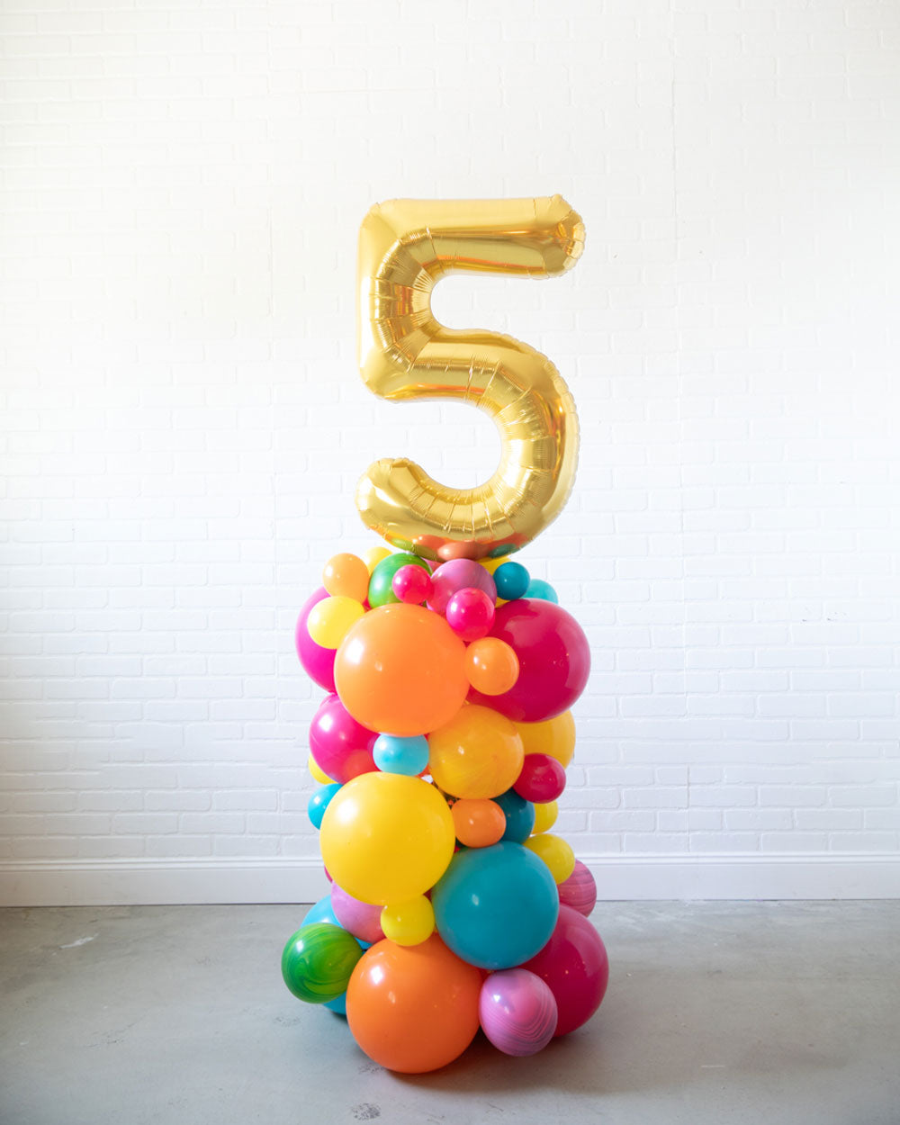 Our Trolls themed balloon column is an adorable addition to your Trolls themed kids birthday party! Created with air-filled balloons and topped with a gold foil number, this balloon arrangement is a picture perfect party.