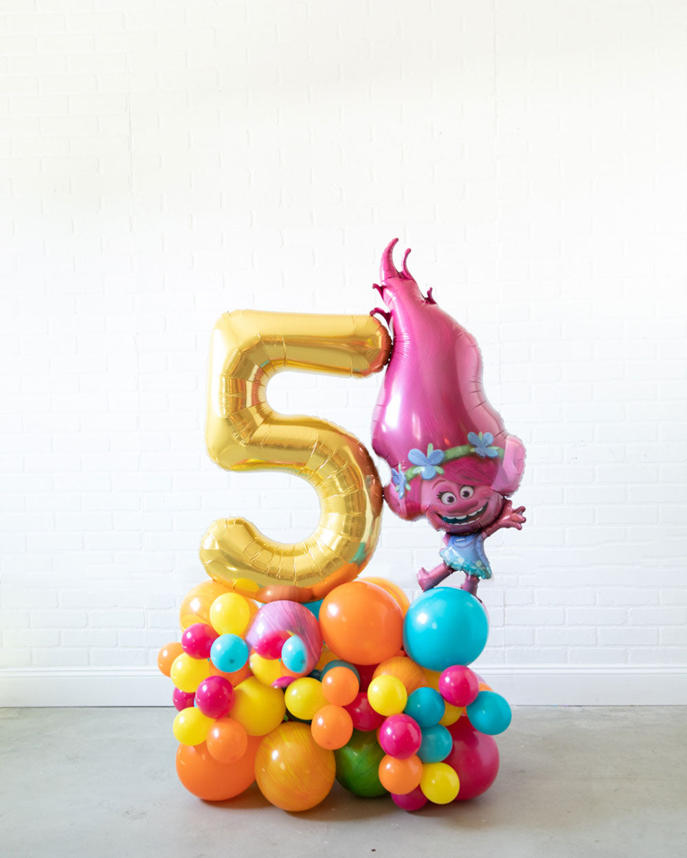 Add a fun touch to your kids birthday with our Trolls inspired number and foil pedestal. This includes a 34" gold number and Poppy balloon to make a statement at your Trolls themed party. Celebrate any age and dress up your sweets table or photo backdrop for a unique look.
