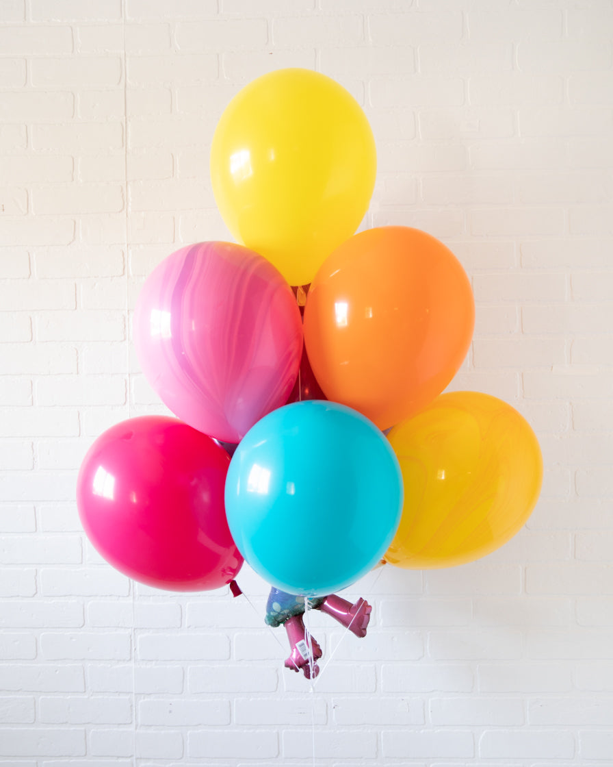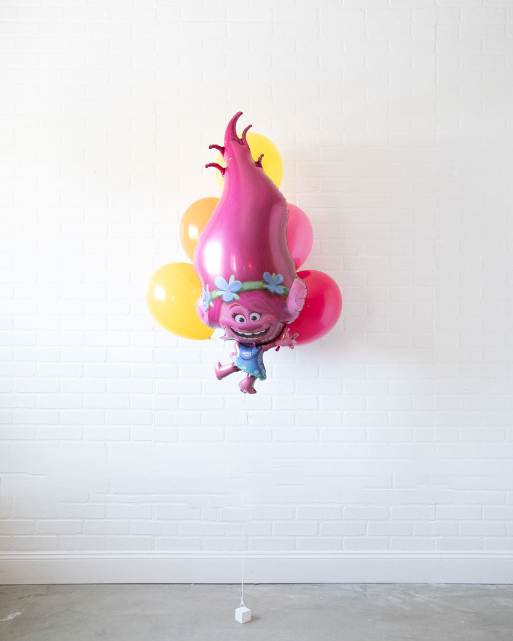 This fun bouquet with bright helium-filled balloons and a foil happy birthday Poppy balloon is great for a Trolls themed kids party. Place around the room or near a sweets table and photo backdrop for extra impact.