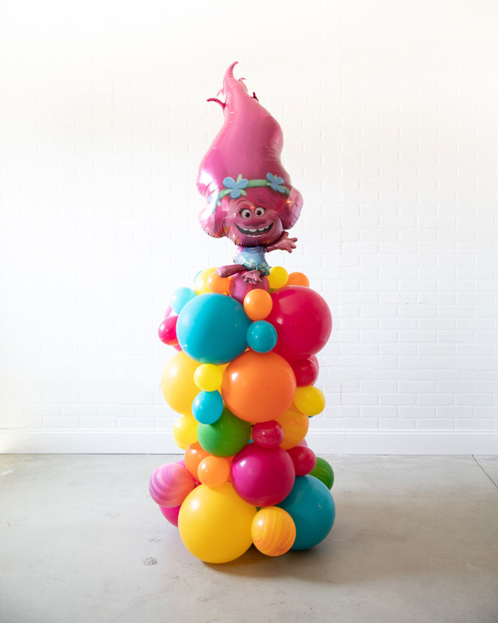 Our Trolls inspired balloon column is a hit for your little ones birthday party! Created with air filled bright balloons and topped with a Poppy balloon, this arrangement is perfect for a birthday of any age. Use this for a sweets table or part of your photo backdrop.