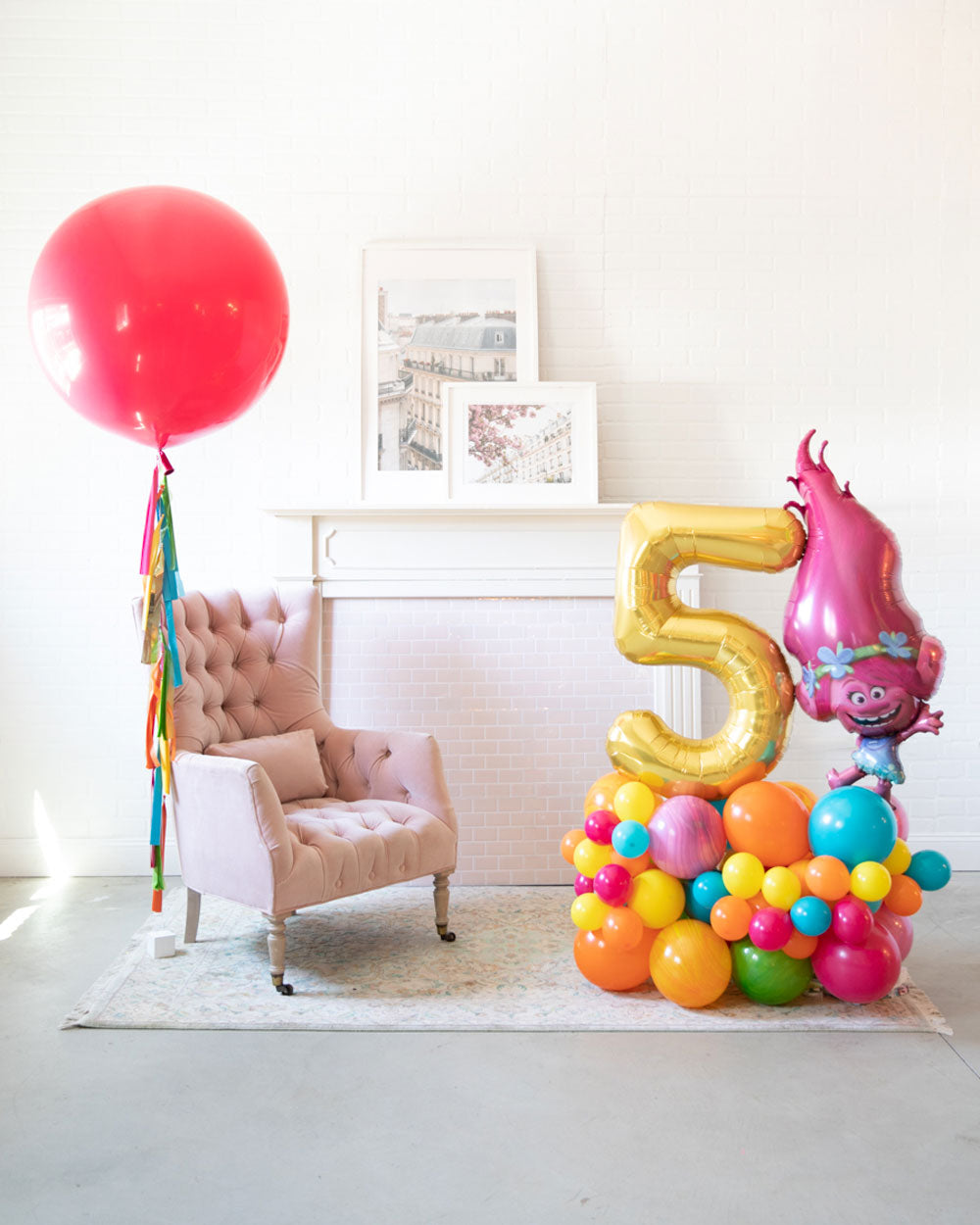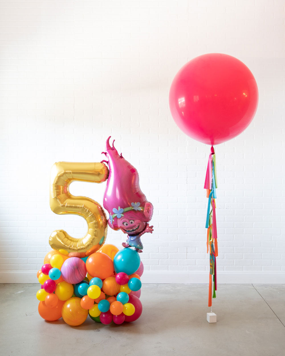 Make a bold birthday statement for a fun Trolls themed kids birthday! Use this giant balloon with tassel garland and number pedestal to dress up any space! This design includes a gold mylar number and Poppy mylar balloon for extra fun.