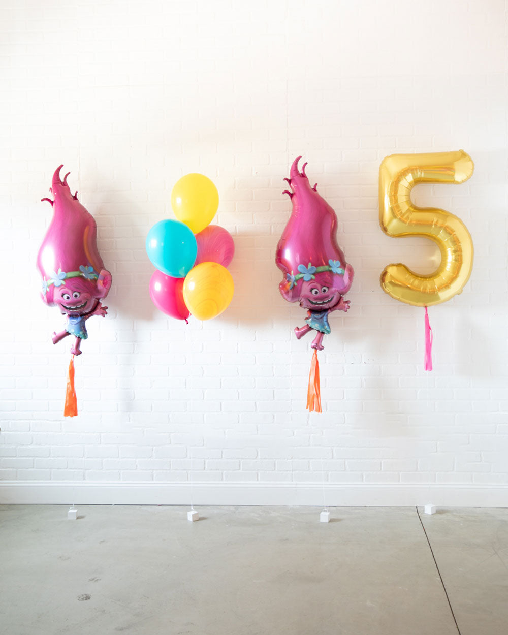 Create an extra fun birthday with this Trolls party set. This includes two Poppy balloons, bouquet of latex balloons and a gold number foil balloon. Use this around the room of any space for extra fun birthday decor.