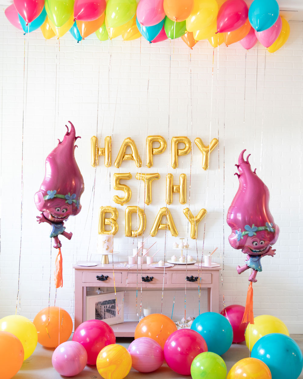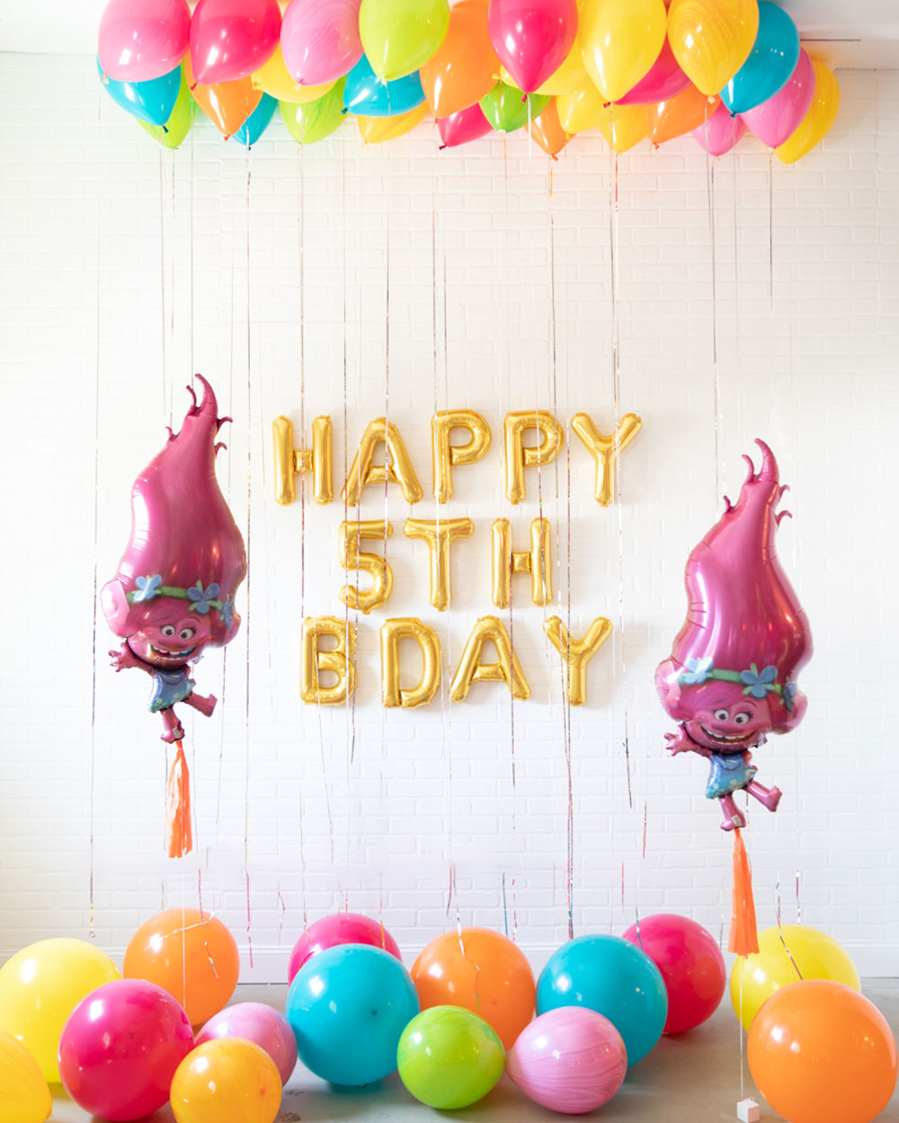 Create a Trolls inspired party for his birthday. This set includes helium filled ceiling balloons, floor balloons, a balloon banner, and two Poppy foil balloons to complete the look.