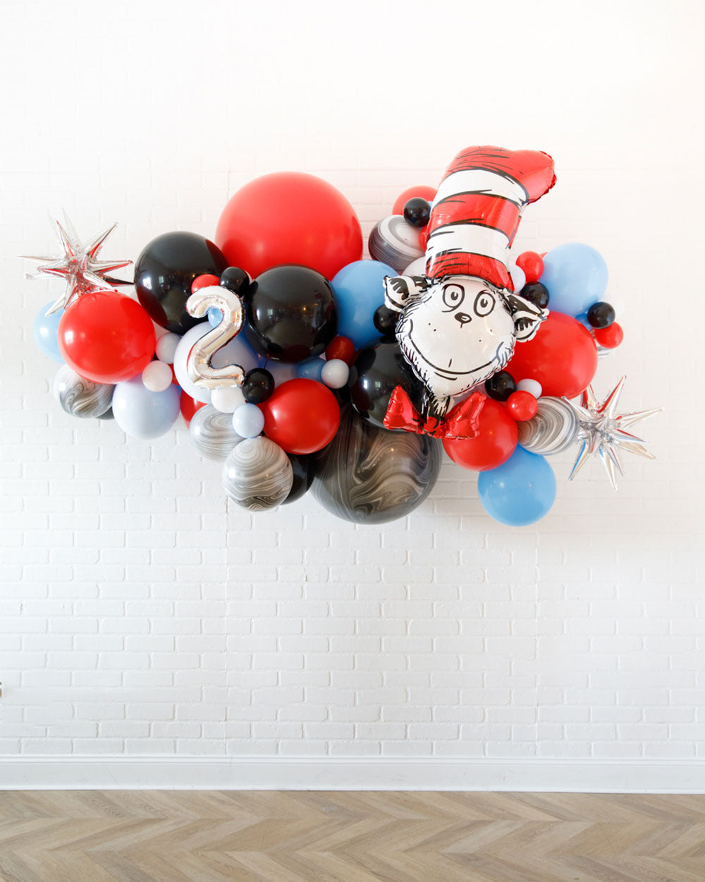 Spread some cheer with this eye-catching balloon garland. A great way to celebrate an important occasion, this air-filled 6ft balloon backdrop piece can be installed above a sweets table or on a wall for a photo op. Includes a Cat in the Hat balloon and silver number foil. Complete the look with giant balloons or balloon columns from this Dr. Suess collection.
