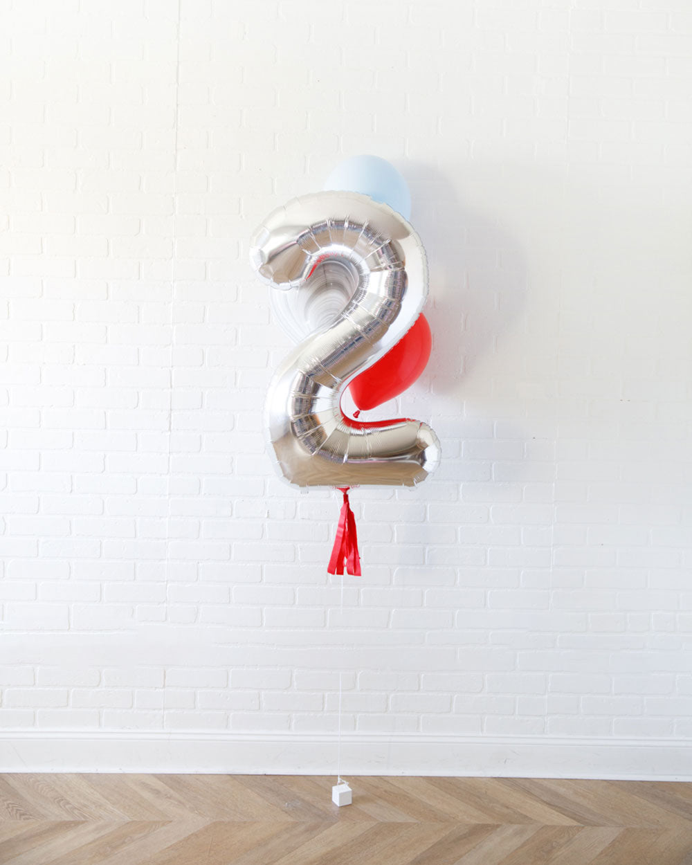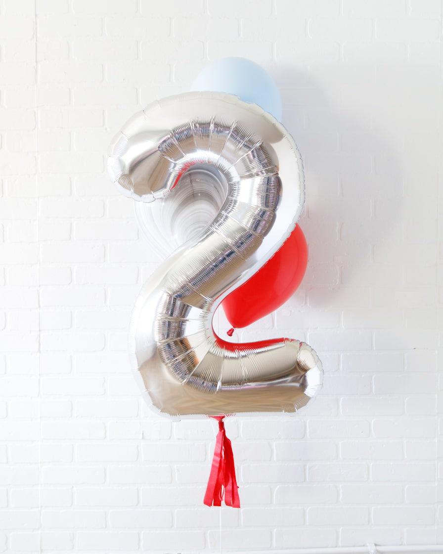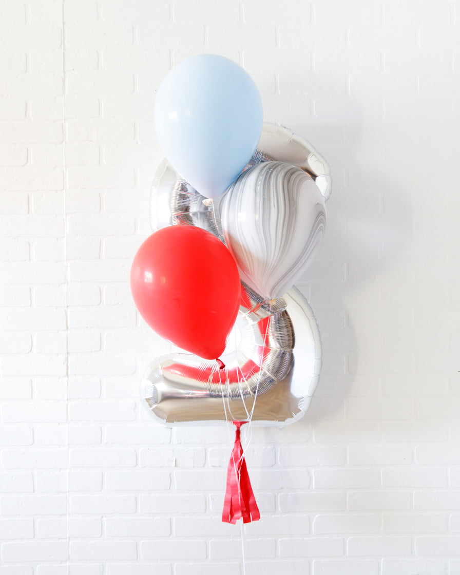 Everyone's favorite, the 34in foil number and skirt turned into a bouquet. This includes a silver number balloon and bright helium filled balloons for an effortless look. Great as decor or as photo prop.