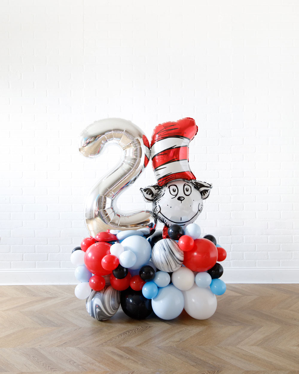 Add a fun touch to your kids birthday with our Dr. Seuss inspired number and foil pedestal. This includes a 34" silver number and Cat in the Hat balloon to make a statement at your Dr. Seuss themed party. Celebrate any age and dress up your sweets table or photo backdrop for a unique look.