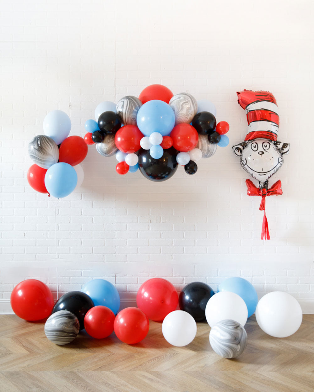 Bring the party to life with this fun and festive Dr. Seuss themed birthday set. This includes a Cat in the Hat balloon and 3ft air filled balloon garland. With a balloon bouquet, add this to your sweets table for an amazing Dr. Seuss themed birthday celebration.