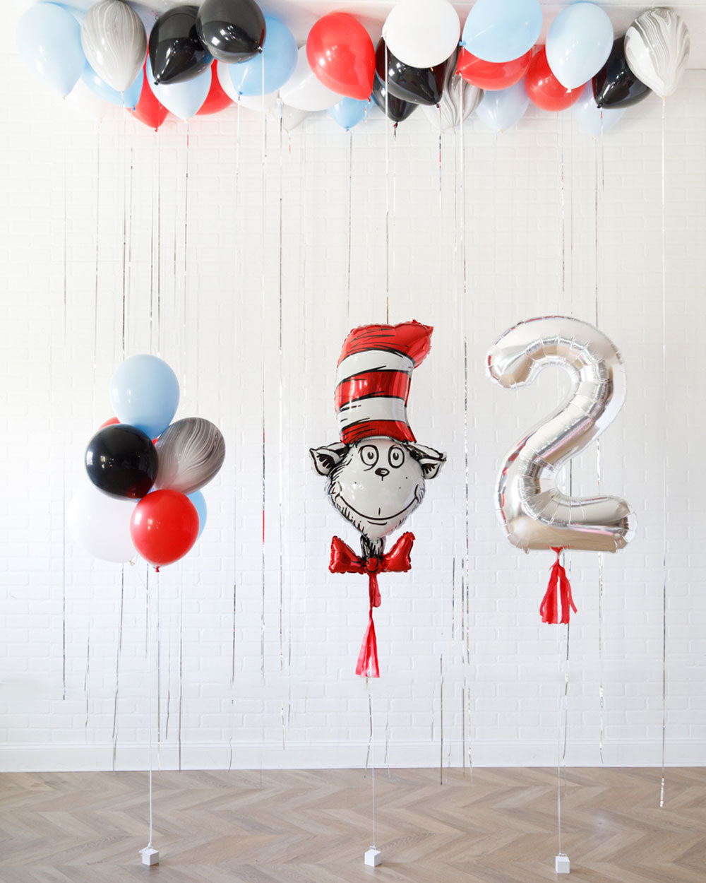 Fill the room with this super fun Dr. Seuss balloon set! This includes ceiling balloons, a Cat in the Hat balloon, number balloon and a balloon bouquet that make the perfect backdrop. Use these bright balloons for your little one's Dr. Seuss themed party.
