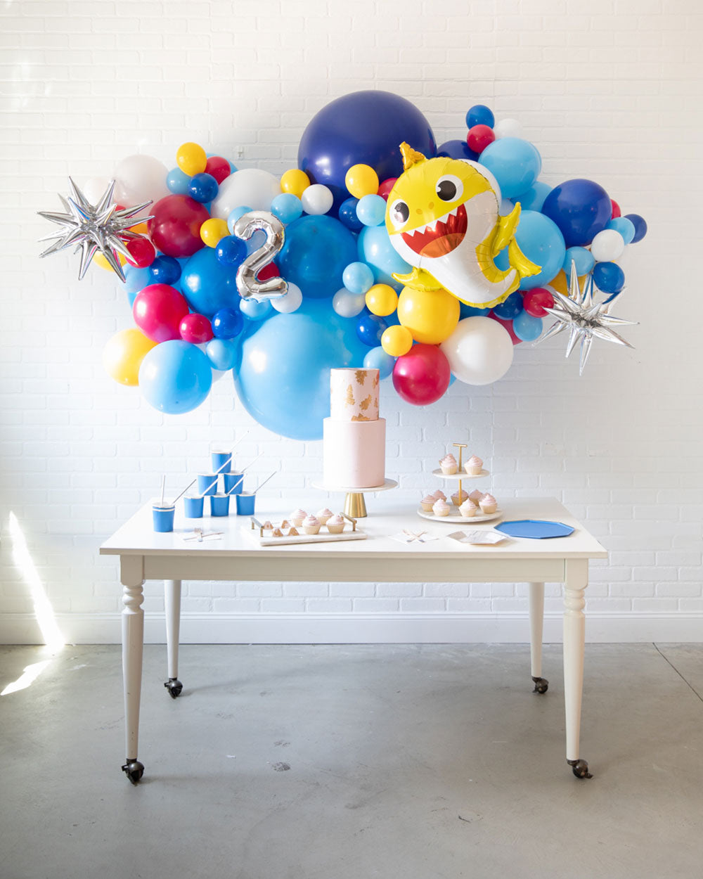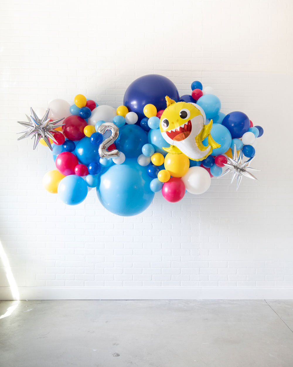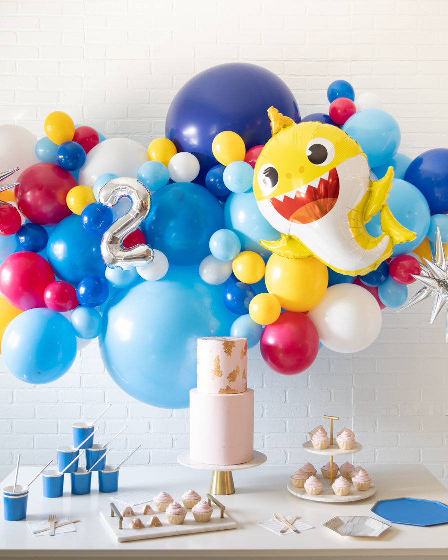 Spread some cheer with this eye-catching balloon garland. A great way to celebrate an important occasion, this air-filled 6ft balloon backdrop piece can be installed above a sweets table or on a wall for a photo op. Includes a Baby Shark balloon and silver number foil. Complete the look with giant balloons or balloon columns from this Baby Shark collection.