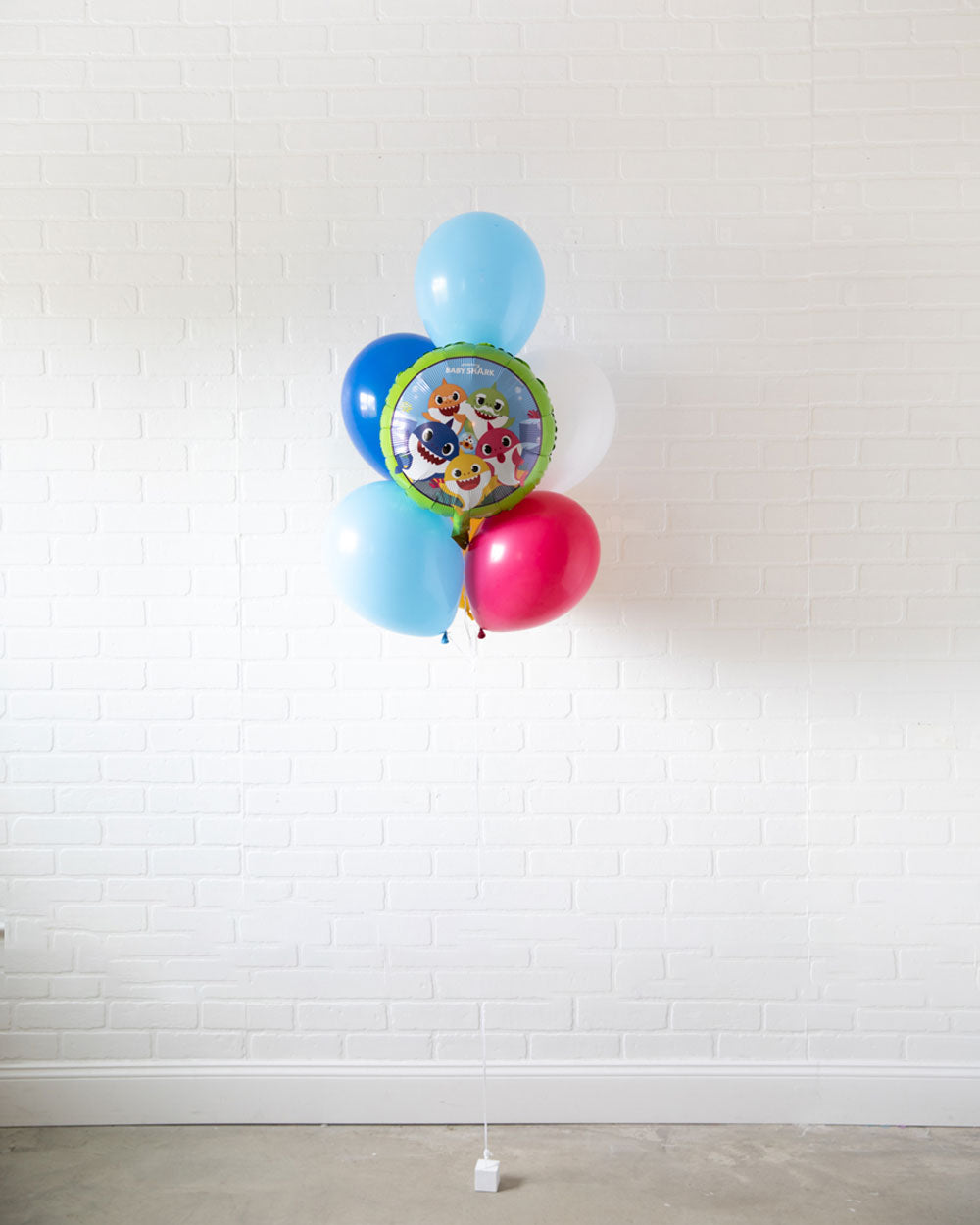 This fun bouquet with bright helium-filled balloons and a foil birthday HBD balloon is great for a Baby Shark themed kids party. Place around the room or near a sweets table and photo backdrop for extra impact.