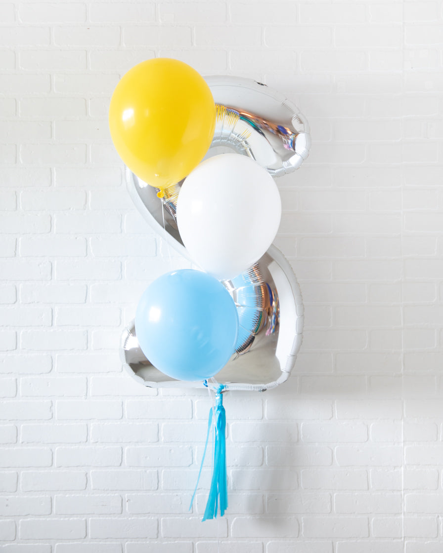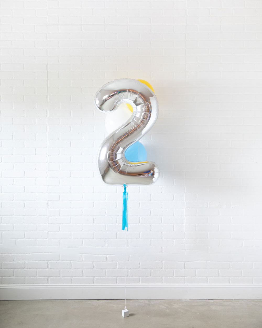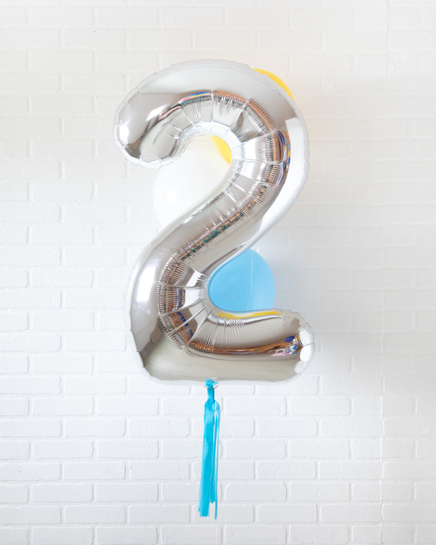 Everyone's favorite, the 34in foil number and skirt turned into a bouquet. This includes a silver number balloon and bright helium filled balloons for an effortless look. Great as decor or as photo prop.