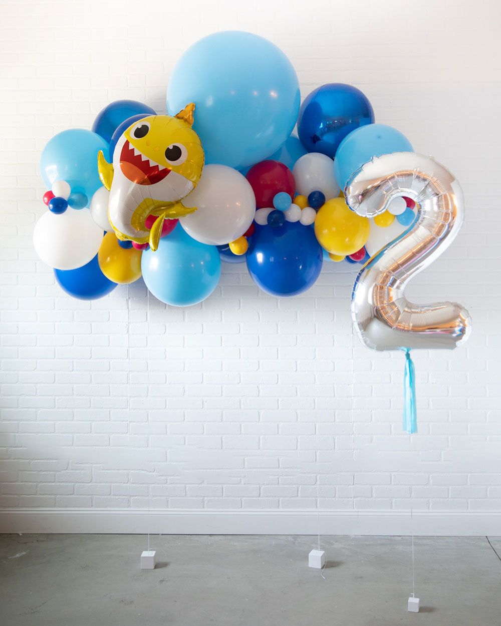 Put the ultimate party together with this Baby Shark balloon birthday set. This set includes a floating balloon arch including a Baby Shark and silver foil number. In bold shades, this works perfectly for a little one's Baby Shark themed birthday party.