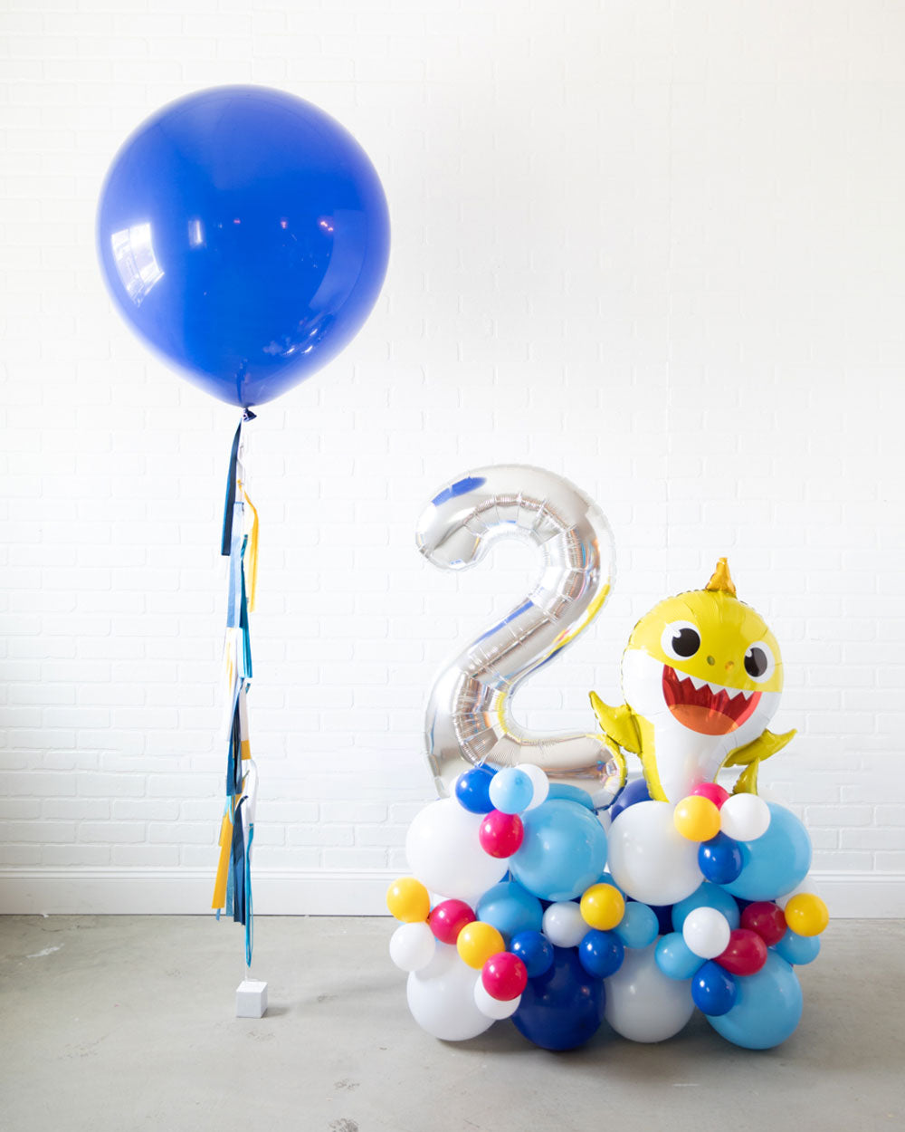 Make a bold birthday statement for a fun Baby Shark themed kids birthday! Use this giant balloon with tassel garland and number pedestal to dress up any space! This design includes a silver mylar number and Baby Shark mylar balloon for extra fun.